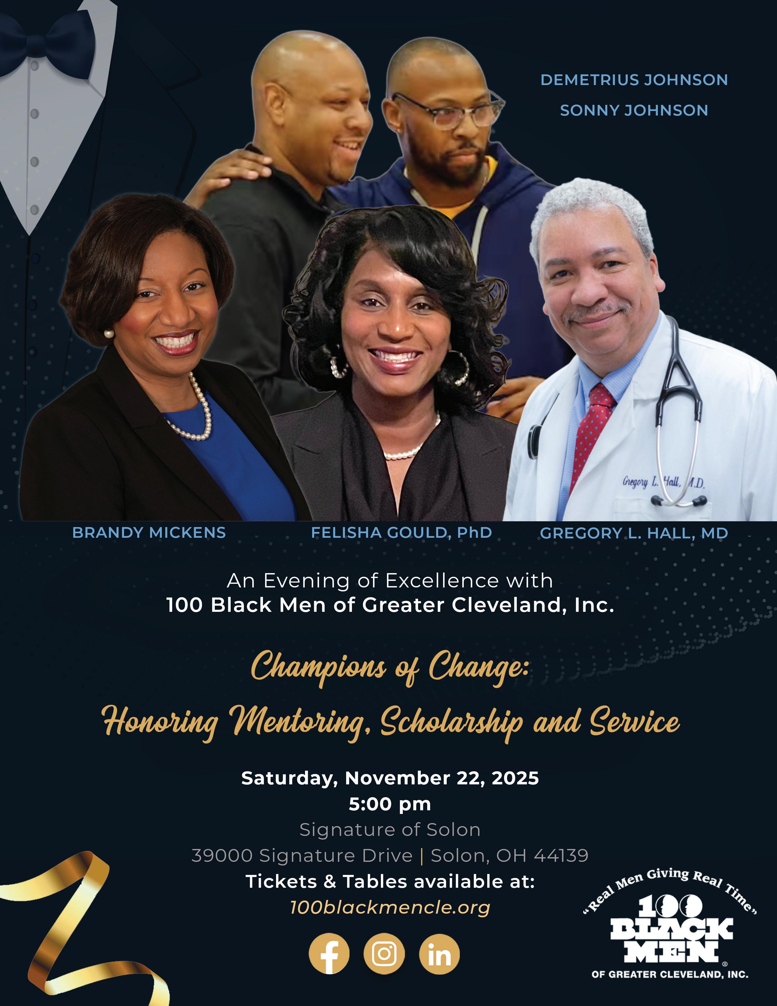 100 Black Men of Greater Cleveland, Inc. hosts its Evening of Excellence, “Champions of Change: Honoring Mentoring, Scholarship, and Service, ” on November 22, 2025. This premier fundraising event highlights the organization’s programs, honors individuals who exemplify its mission, and celebrates the achievements of the students it serves. This year’s awardees include: