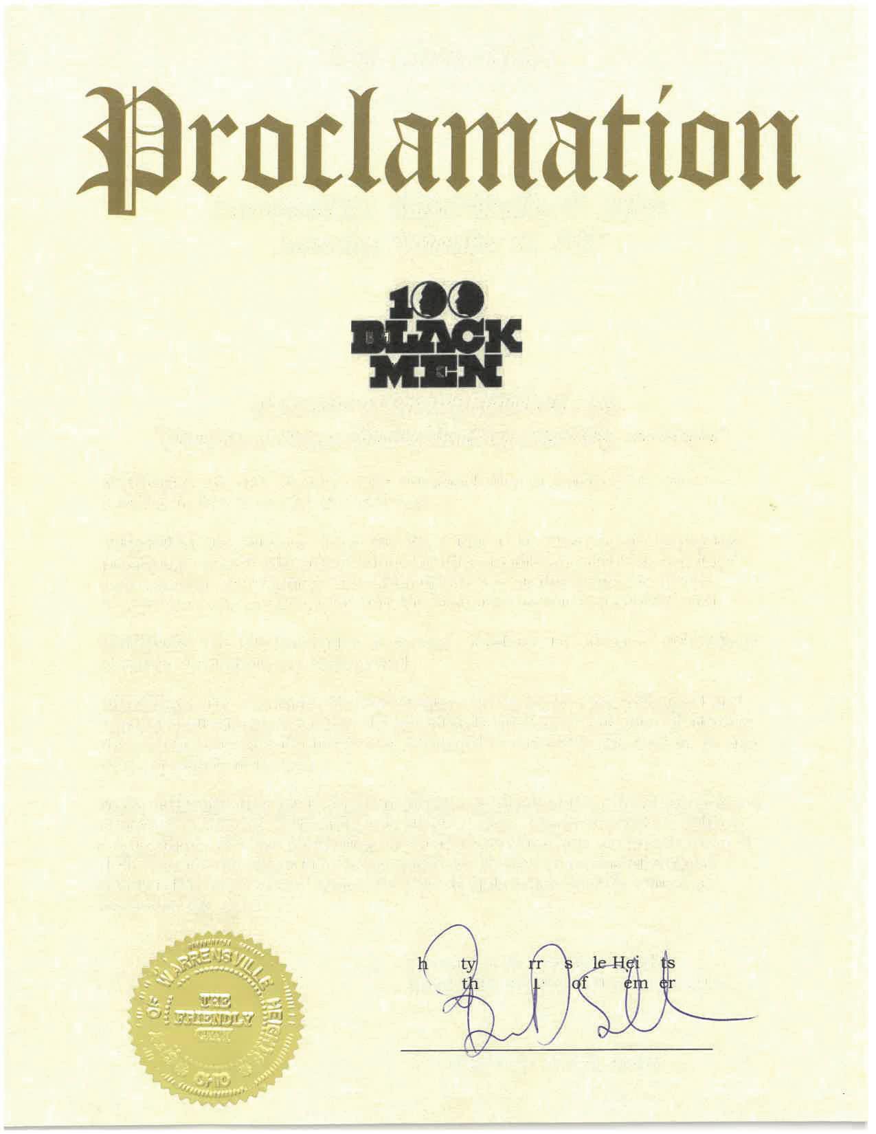 NOW, THEREFORE, BE IT PROCLAIMED, that I, Benjamin I. Holbert, III, Mayor of the Village of Woodmere, on behalf of our residents and administration, extend congratulations and appreciation to the 100 Black Men of Greater Cleveland, Inc., its leadership, and honorees for their lasting contributions to the Greater Cleveland community.