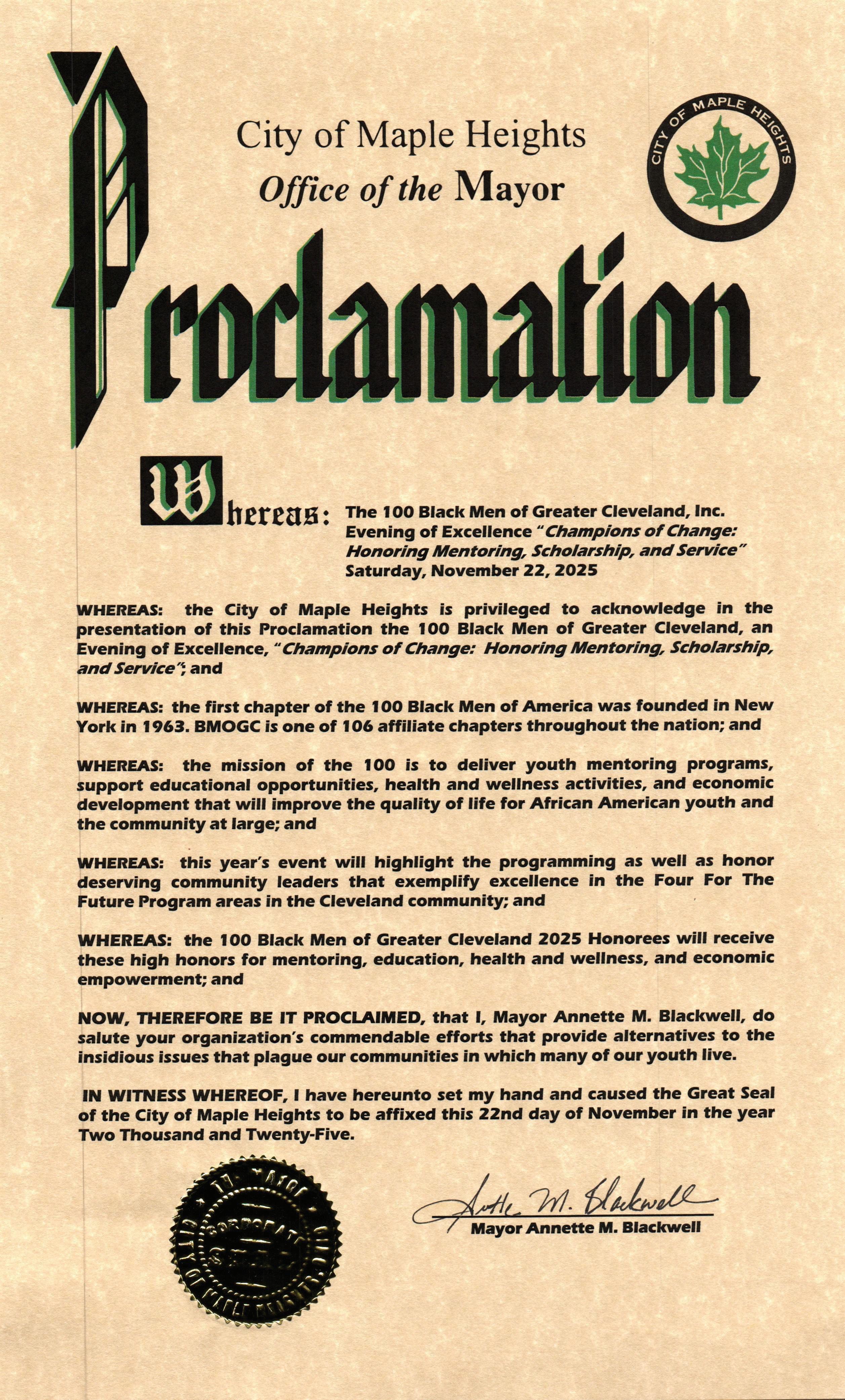 WHEREAS, on Saturday, November 22, 2025, the organization will host An Evening of Excellence at the Signature of Solon, honoring “Champions of Change: Mentoring, Scholarship, and Service” and recognizing: