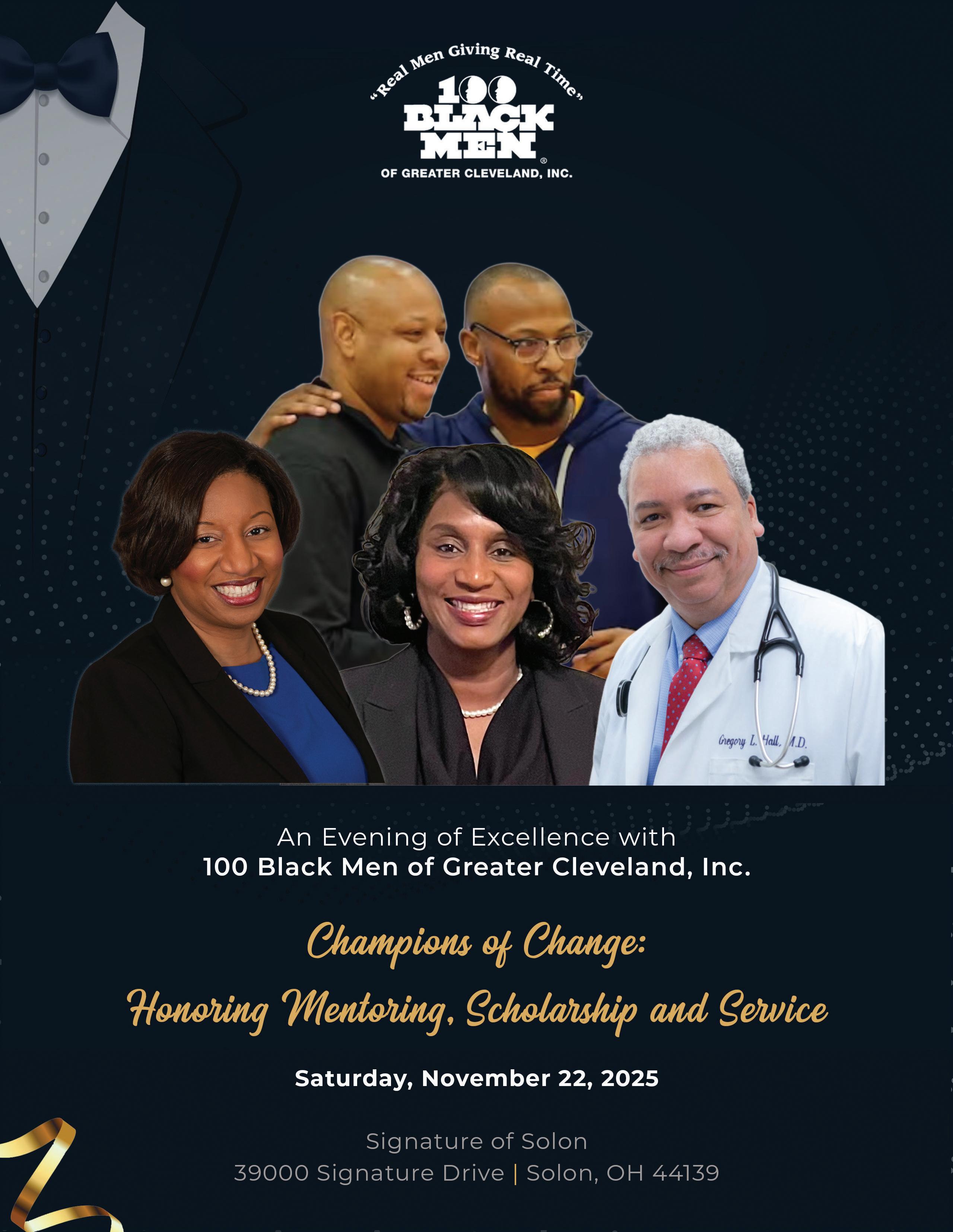 On behalf of the Board of Directors and all our members it is my great pleasure to welcome you to An Evening of Excellence with the 100 Black Men of Greater Cleveland, Inc., celebrating Champions of Change: Honoring Mentoring, Scholarship, and Service. Tonight we come together to reflect on the lives we’ve touched, the progress we’ve made, and the promise of what’s still to come.