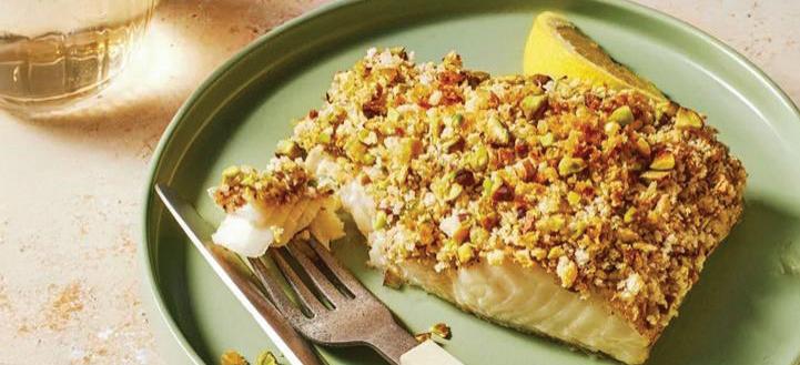 A layer of pistachios combined with panko breadcrumbs on top of the halibut fillets provides a delicious crunch and a pop of vitamin B6, a nutrient important for blood sugar regulation. We like the firm texture and mild flavor of halibut, but cod, haddock, or tilapia can be used in its place.