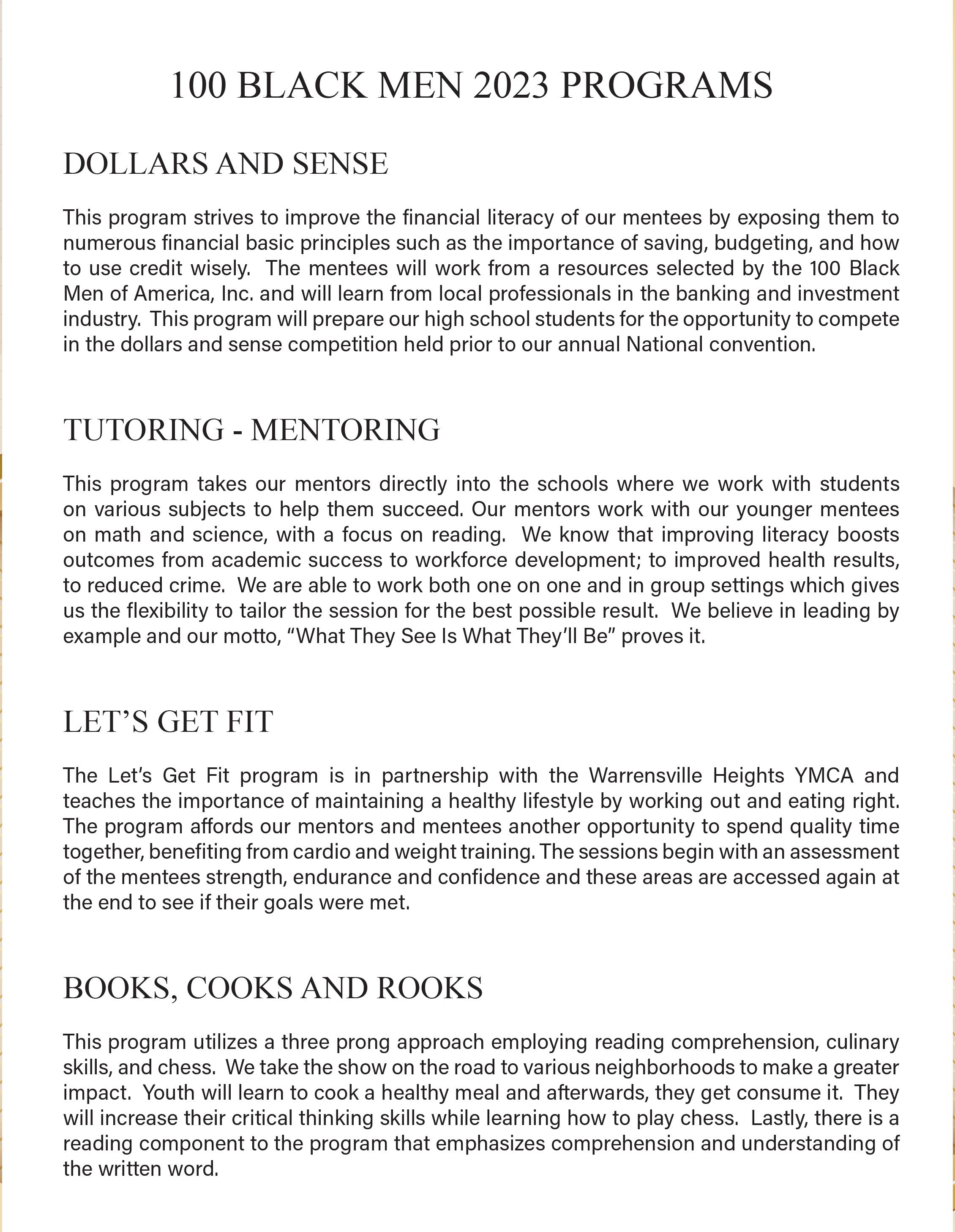 In 2022, a class of 22 new members came in, and in 2023, the chapter is still thriving. Now, in 2024, celebrating twenty-sevenyears,aftersevenchairmenandnumerousgalas,youcanstillfindthemenmentoringinsuchschools as Wade Park Ken,neth Clement Boys Leadership Academy, and The Friendly Inn Settlement, to name a few.