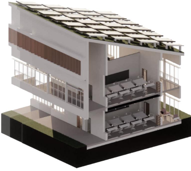Using the heat analysis to find out the parts of the building that the sun shines on the most throughout the day. For this case, it is mainly focused on the roof , which is why a green roof system was implented and solar panels was added too to nake use of the full day of sunlight. FIG