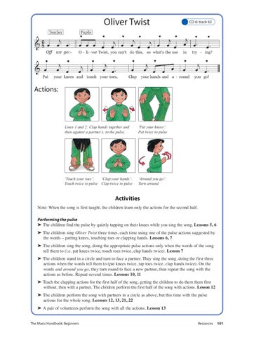 Activities Note: When the song is first taught, the children learn only the actions for the second half. Performing the pulse The children find the pulse by quietly tapping on their knees while you sing the song. Lessons 5, 6 The children sing Oliver Twist three times, each time using one of the pulse actions suggested by the words – patting knees, touching toes or clapping hands. Lessons 6, 7 The children sing the song, doing the appropriate pulse actions only when the words of the song tell them to (i.e. pat knees twice, touch toes twice, clap hands twice). Lesson 7 The children stand in a circle and turn to face a partner. They sing the song, doing the first three actions when the words tell them to (pat knees twice, tap toes twice, clap hands twice). On the words and around you go, they turn round to face a new partner, then repeat the song with the actions as before. Repeat several times. Lessons 10, 11 Teach the clapping actions for the first half of the song, getting the children to do them them first without, then with a partner. The children perform the first half of the song with actions. Lesson 12 The children perform the song with partners in a circle as above, but this time with the pulse actions for the whole song. Lessons 12, 13, 21, 22 A pair of volunteers perform the song with all the actions. Lesson 13 The Music Handbook: Beginners