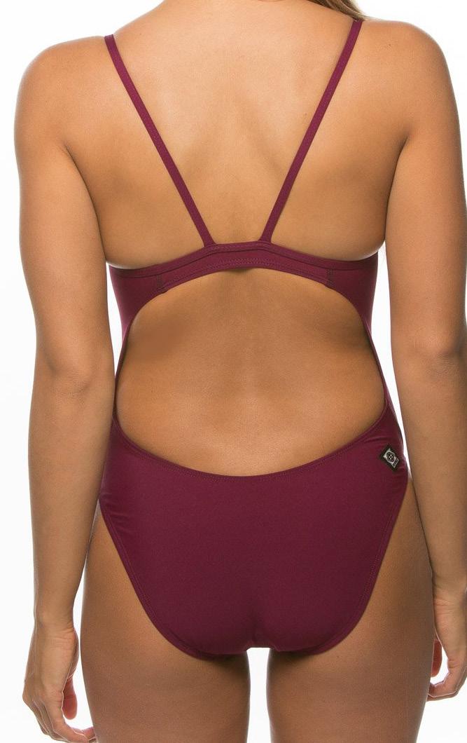 The Murray is a non-adjustable one piece swimsuit with four criss-cross back straps and a slim band around the ribcage. This suit features a filled-in side panel for a secure and flattering silhouette.