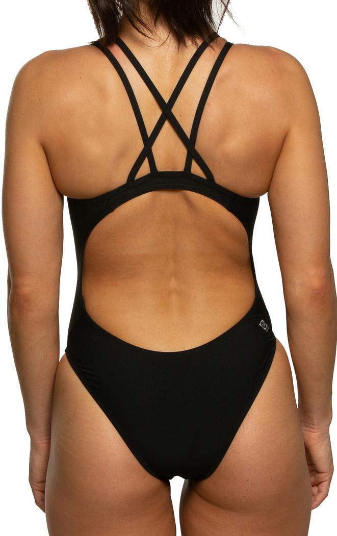 The Perry is a non-adjustable swim onesie that features contrasting stitching and binding for an athletic look. The contemporary design includes two overthe-shoulder straps that criss-cross along the back and transition into a cut-out detail along the ribcage.