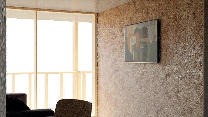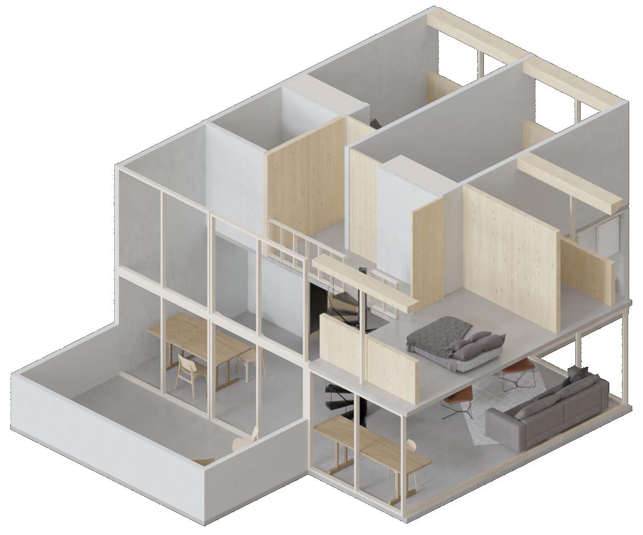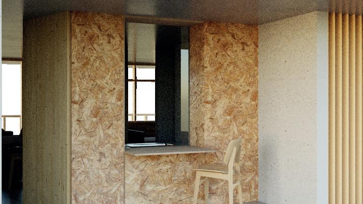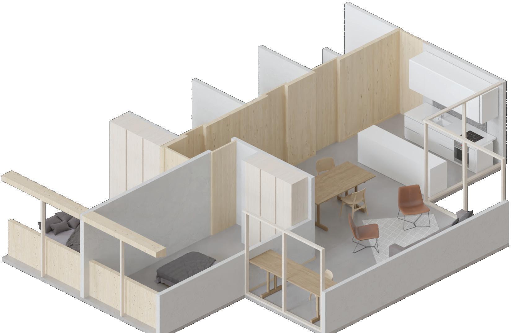 El módulo fundamental para las particiones interiores se compone por medio de tableros de OSB con aislantes térmicos y acústicos para asegurar comfort y privacidad al interior de cada habitación. Esto con el fin de que se tenga una partición que sea fácil de instalar y desinstalar, para que cada unidad de vivienda sea lo más flexible posible y no se necesiten acabados sobre los muros