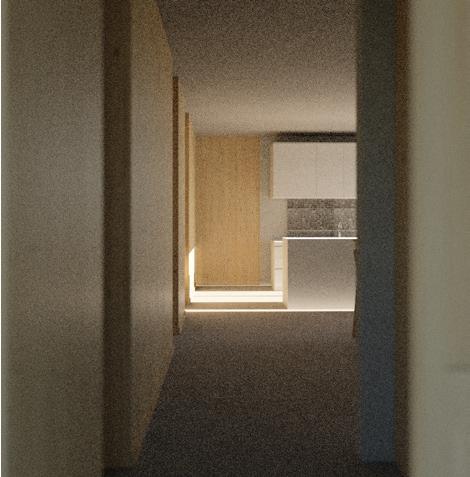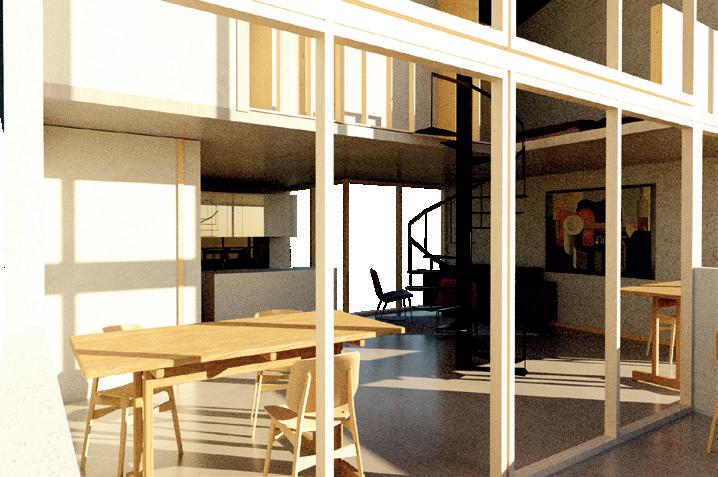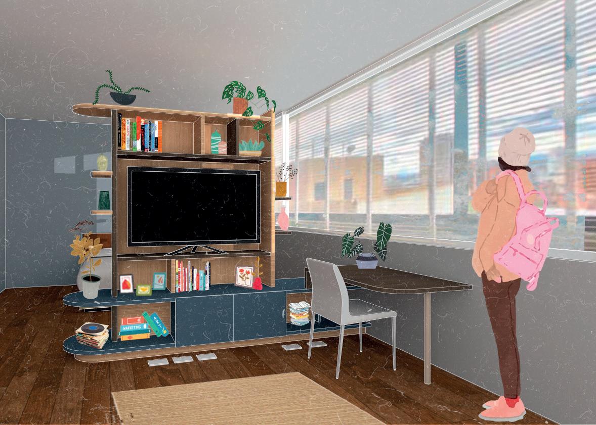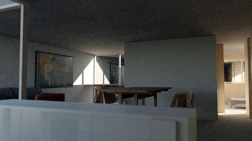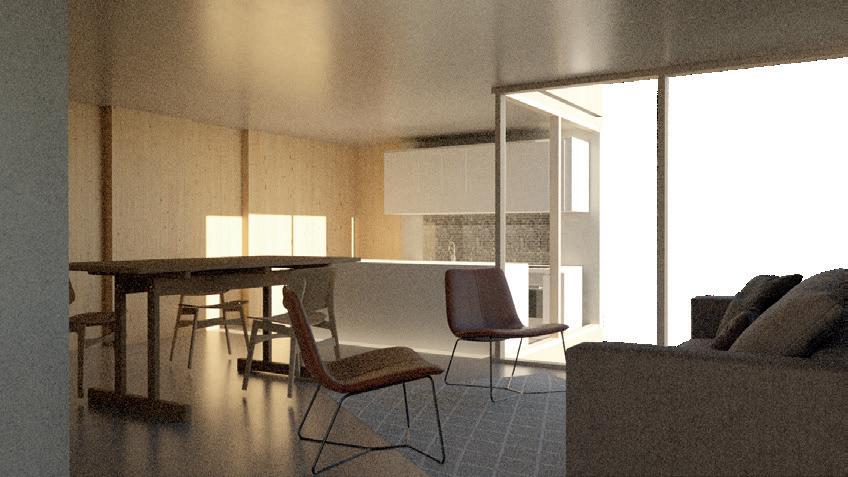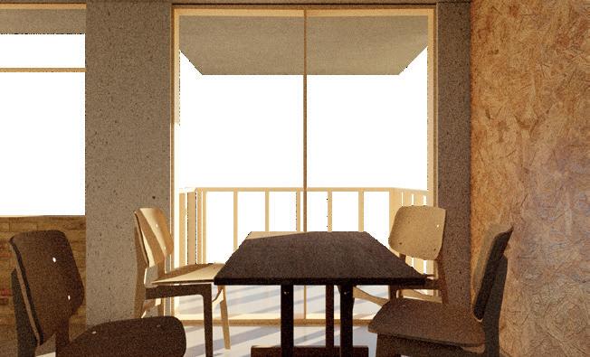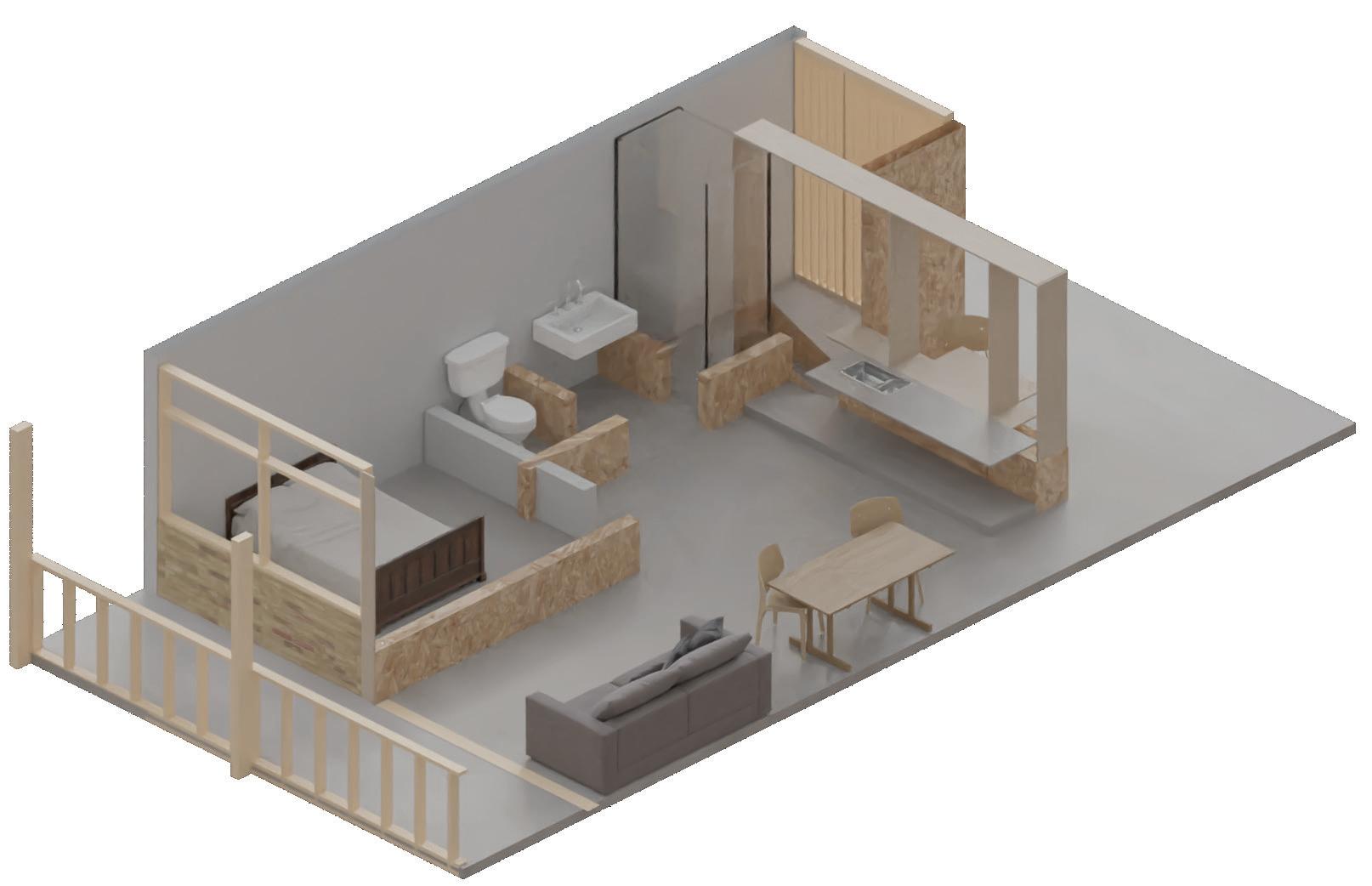 El módulo fundamental para las particiones interiores se compone por medio de tableros de OSB con aislantes térmicos y acústicos para asegurar comfort y privacidad al interior de cada habitación. Esto con el fin de que se tenga una partición que sea fácil de instalar y desinstalar, para que cada unidad de vivienda sea lo más flexible posible y no se necesiten acabados sobre los muros