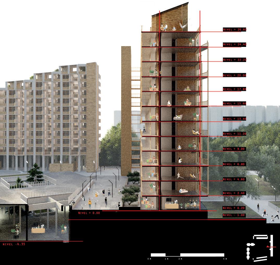 Se plantean en el proyecto espacios comunales tanto en primer piso como en altura con distintos niveles de privacidad: - En primer piso se tienen espacios más abiertos al público y generadores de oportunidades laborales y relaciones entre vecinos de la zona.