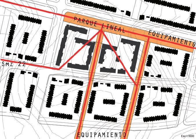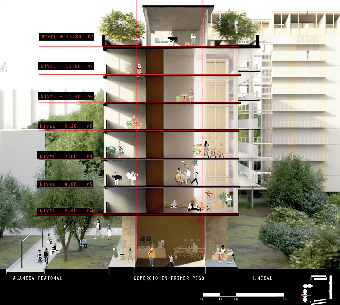 Mediante el planteamiento de un primer piso comercial en el bloque colindante a la alameda se busca tener actividad a lo largo de esta, generando flujo de gente hacia el norte para que conectar con el humedal y el parque.