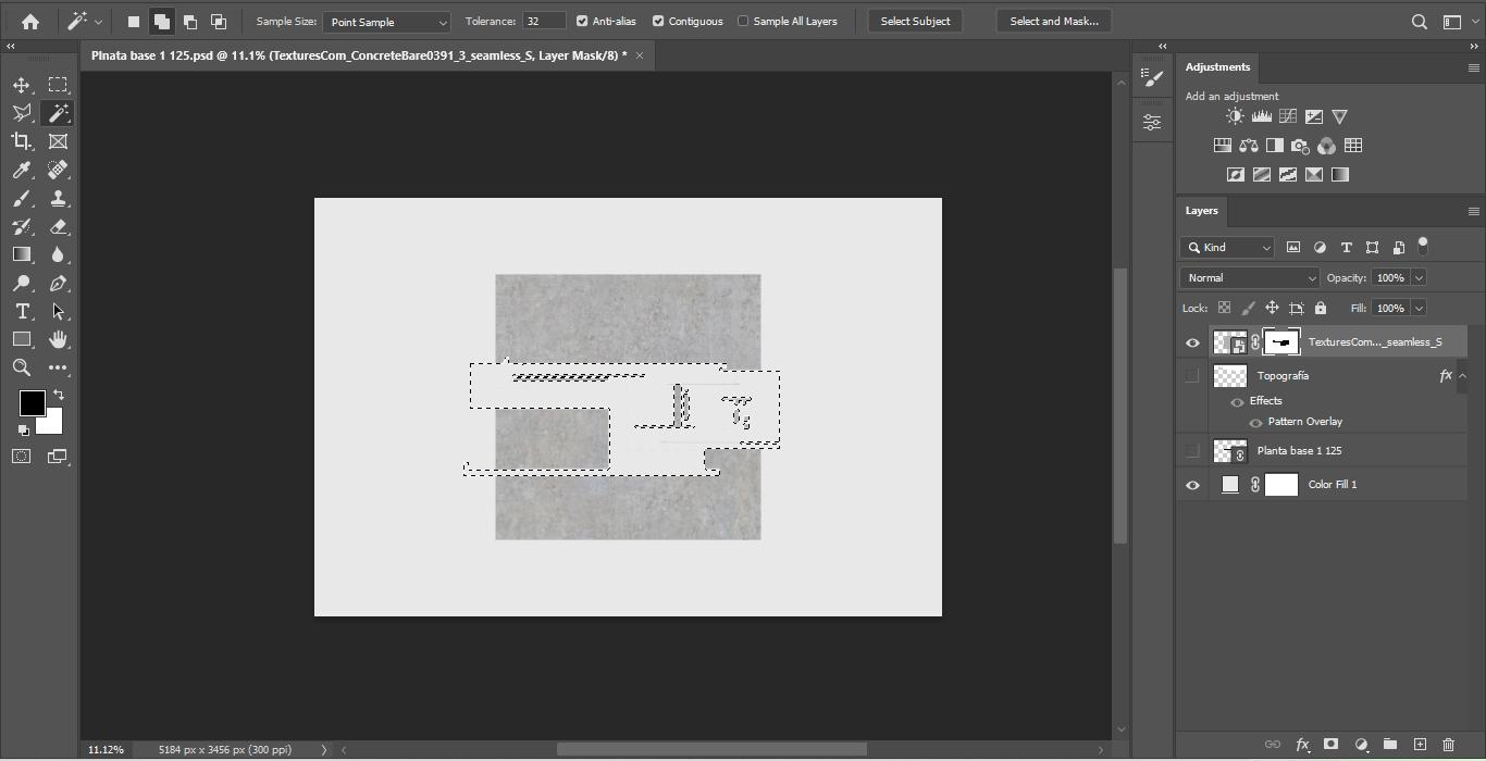 Podemos obtener de manera muy sencilla las sombras de un modelo 3d, en este caso con SketchUp, estas pueden venir con variaciones de tono por efectos de transparencia en el modelo o vacíos que reducen la legibilidad de las sombras, para crear un contraste sutil en la planta podemos aplicar una máscara sobre el png y esconder esas sombras extra