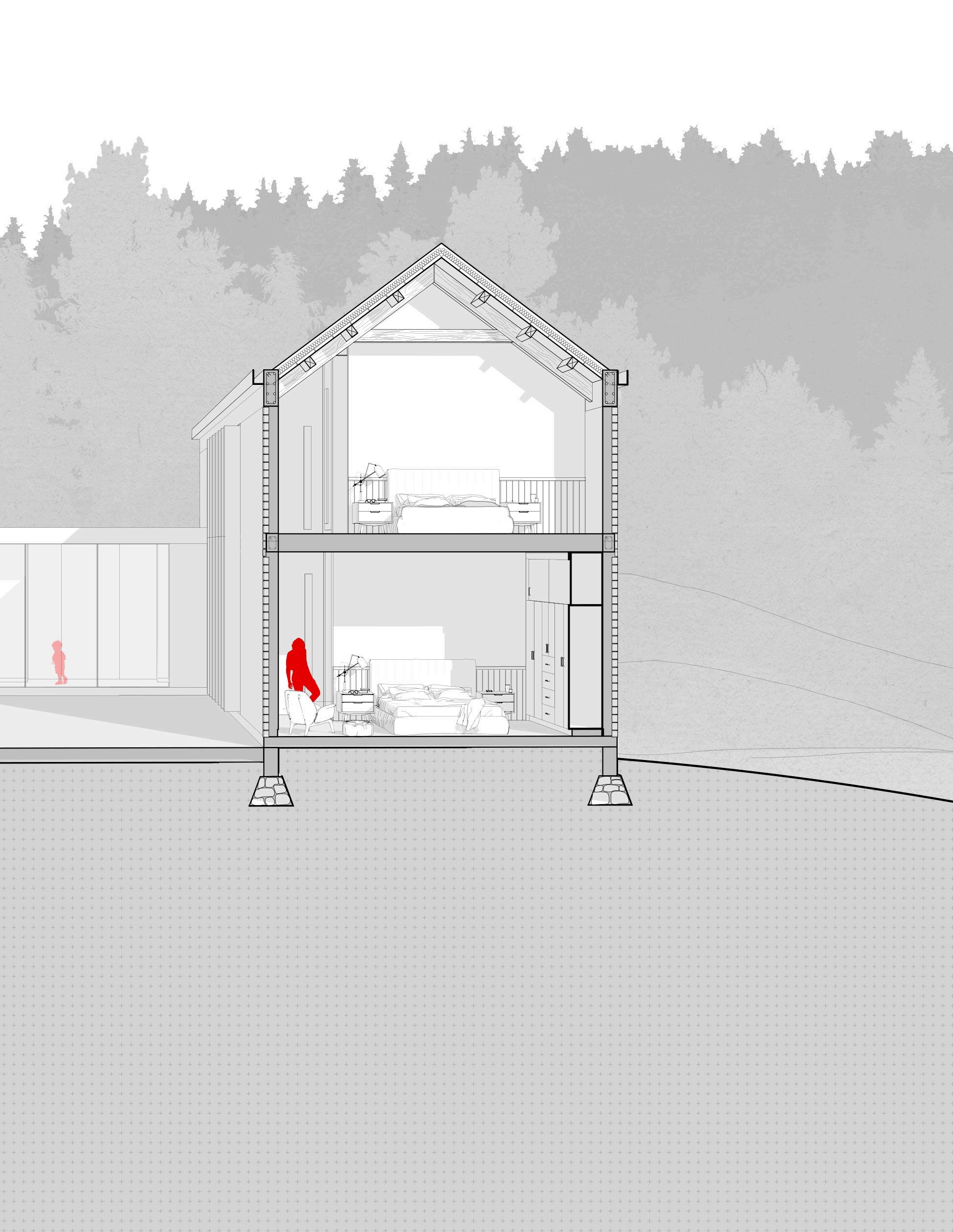 la forma en ambos volúmenes ayuda a orientar las vistas generados a partir de la función a dos aguas por el clima de la región