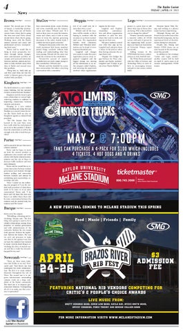 and be proud of the fact that you’re a Baylor student.” Porter said he hopes to move up from his current position as sophomore class senator and work closely with Baylor administration, students and the city of Waco to decrease traffic incidents and have open dialogues. Porter said he would like to increase interaction between student government and students through student polling and interaction between students and alumni by establishing more mentorships, internships and jobs. “How I would see the following year progress if I was the student body president is I think there needs to be more so of an open conversation,” Porter said. “I do know and I do hope that next year there is an ability where there will be more conversation between the students and the student body, the students and The Lariat.”