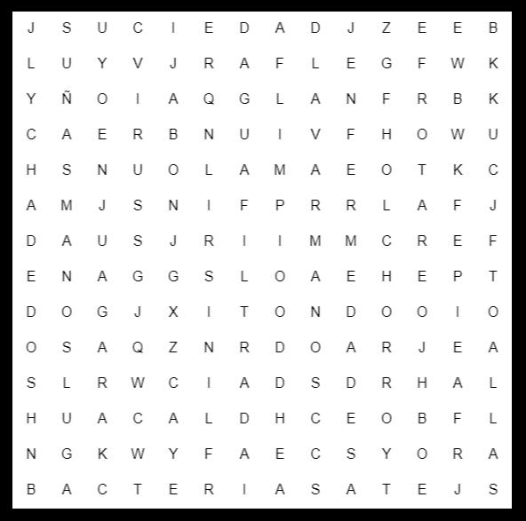 A continuación, encuentra las palabras de abajo en la sopa de letras, busca las palabras de todas las formas posibles. Agua Filtrada Chorro Enfermedades Frotar Jabón Limpio Suciedad Uñas Bacterias Dedos