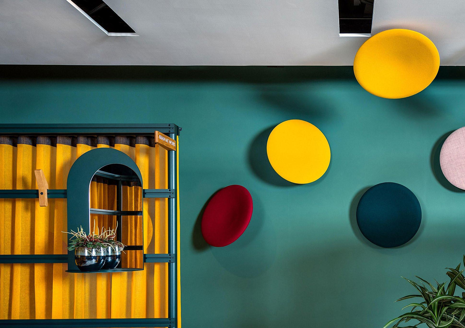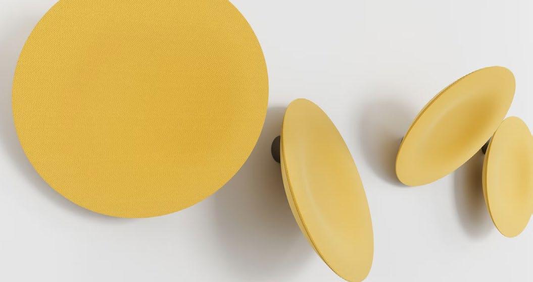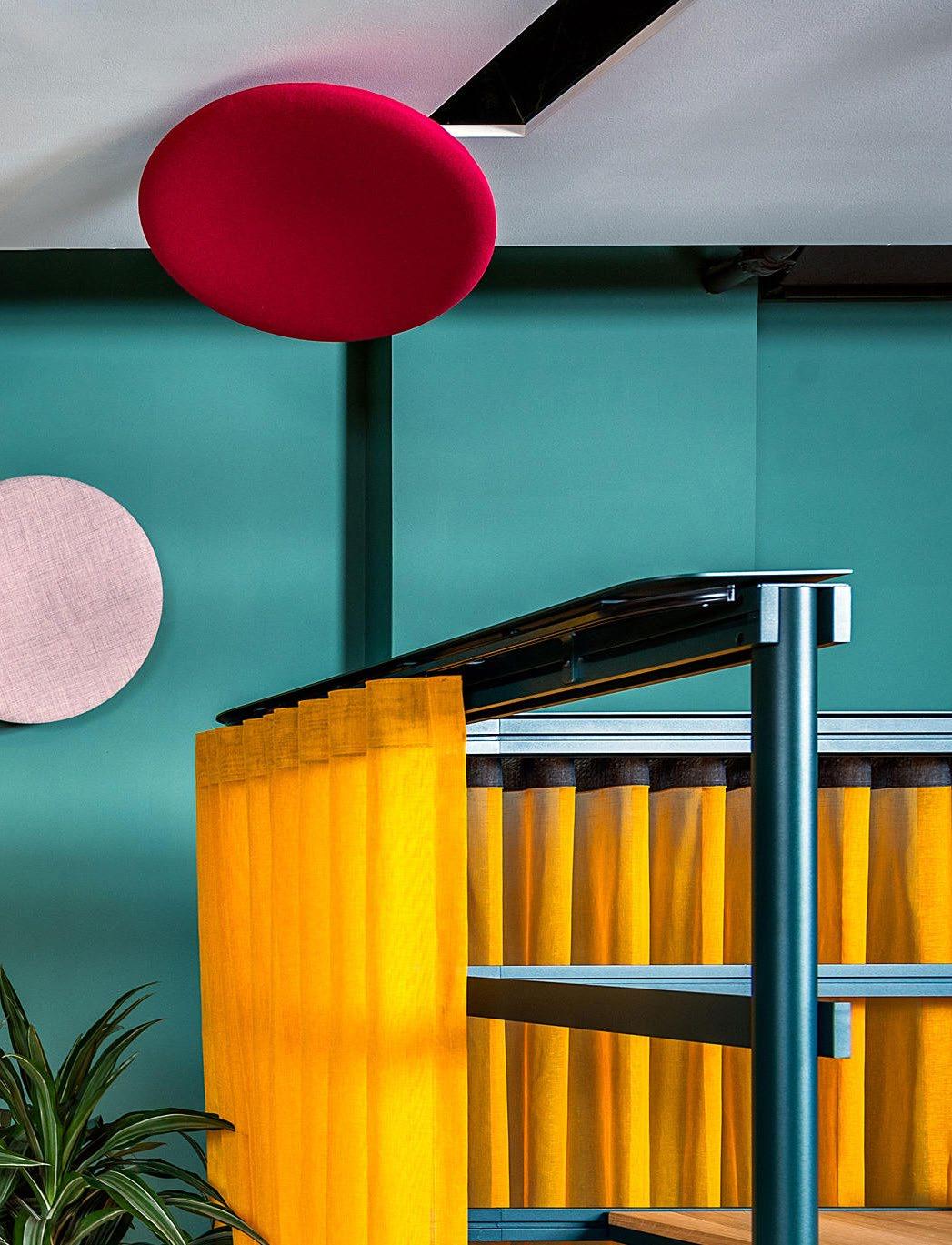 Playful exterior, complex interior. This high-performance acoustic wall and ceiling treatment marries design and function with the recognizable shape, reminiscent of a satellite dish.