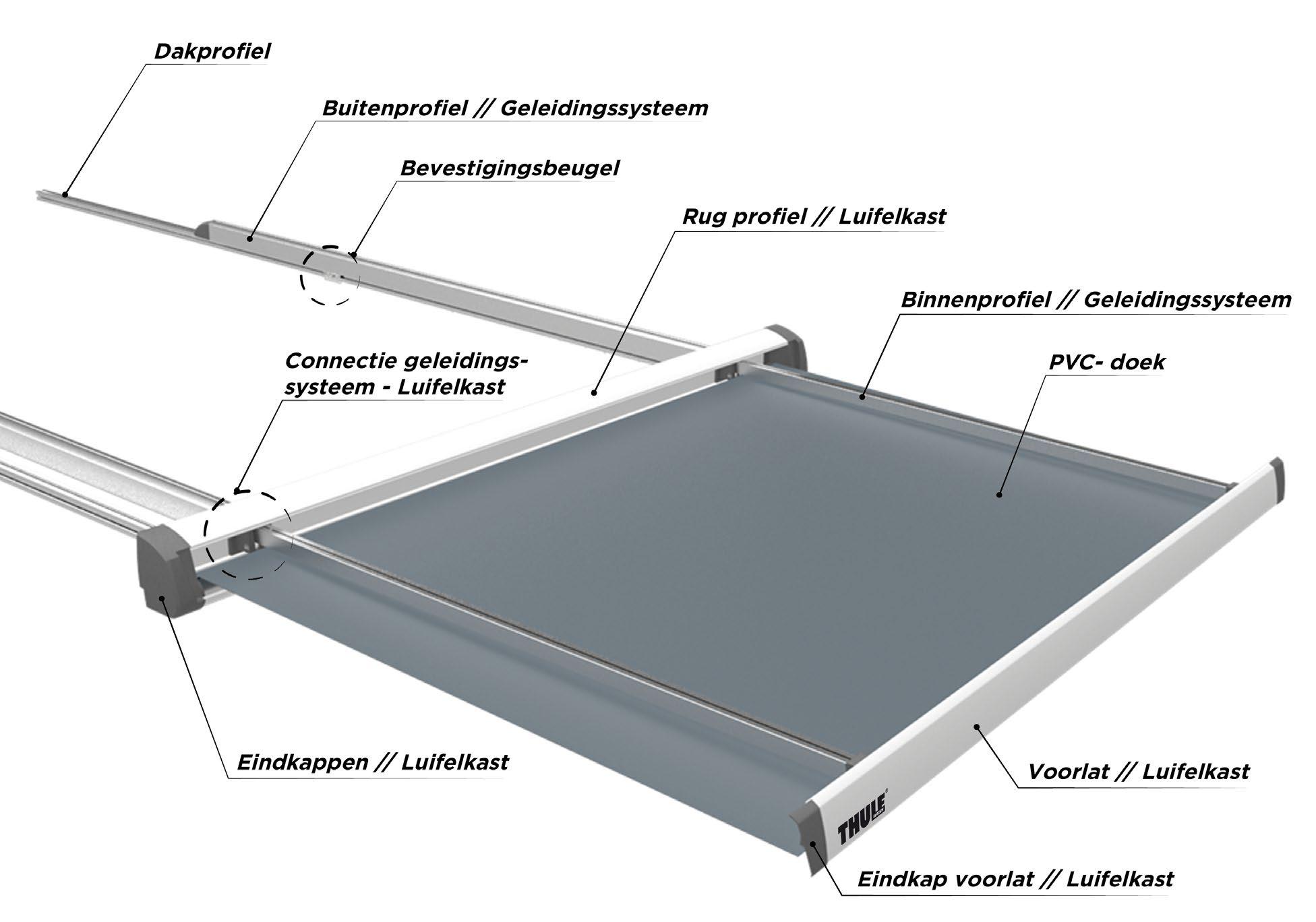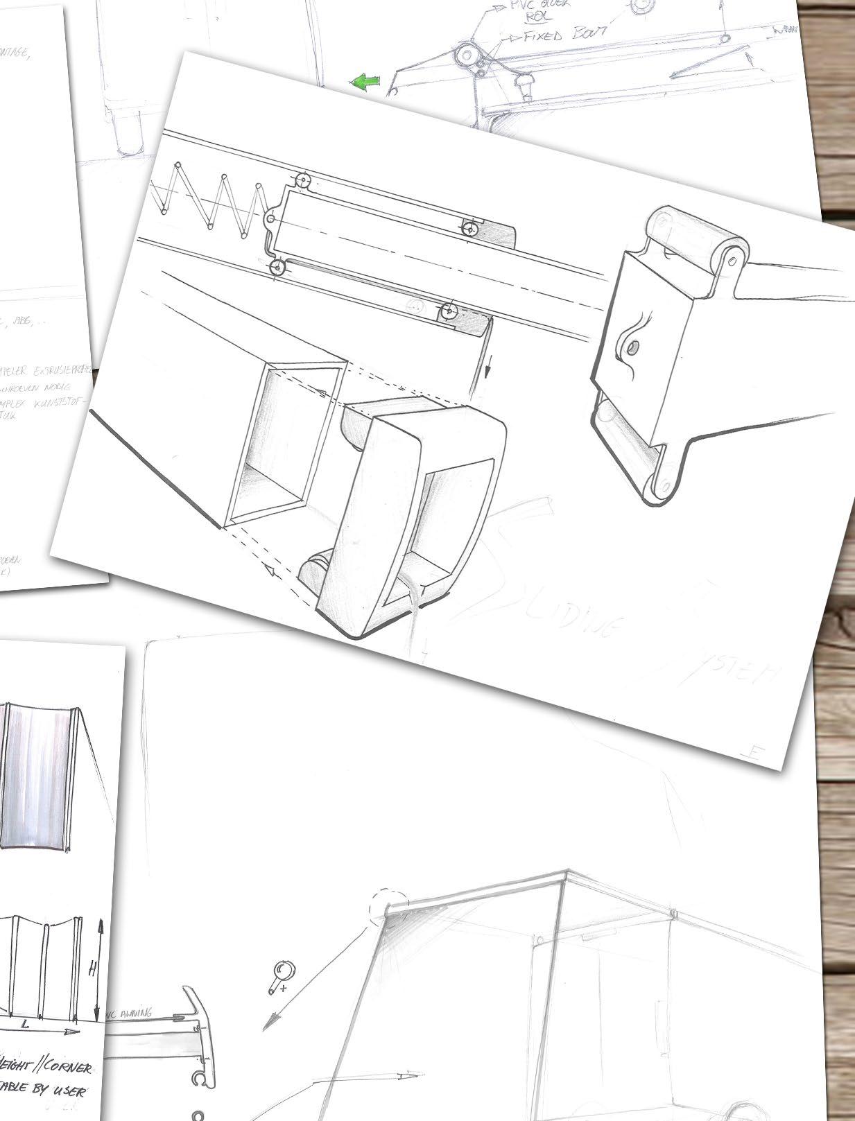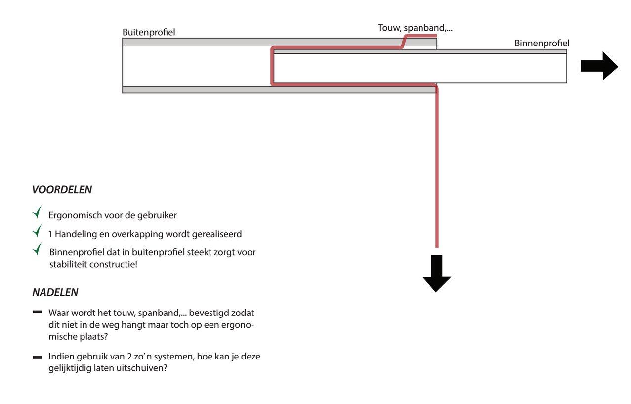 I chose to work out a concept where 2 profiles slide out of each other and push a pvc covering out to obtain an awning system. To make sure this system of sliding profiles would work, I tested this with small prototypes which gave positive results.