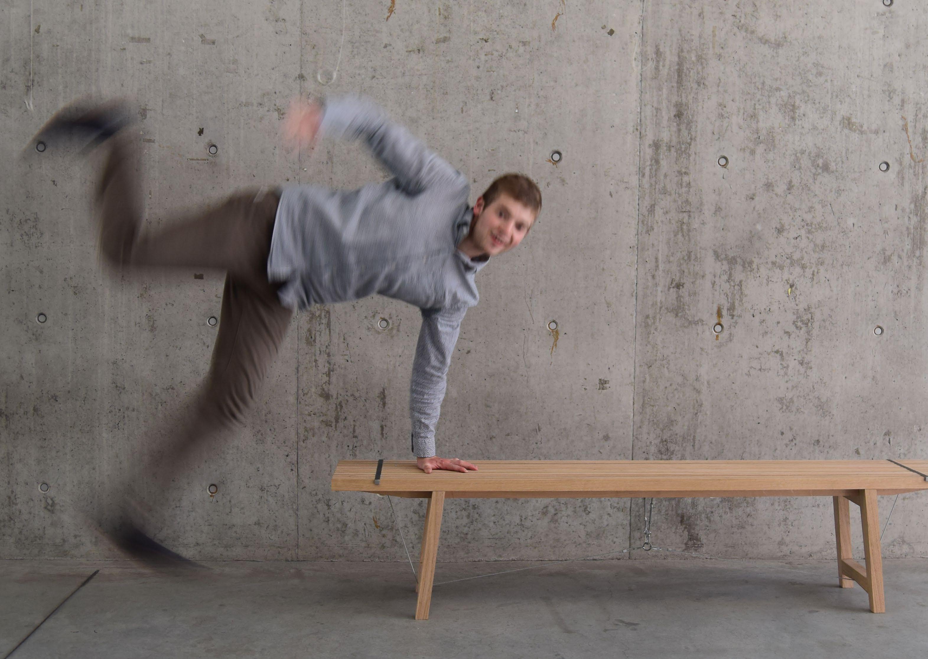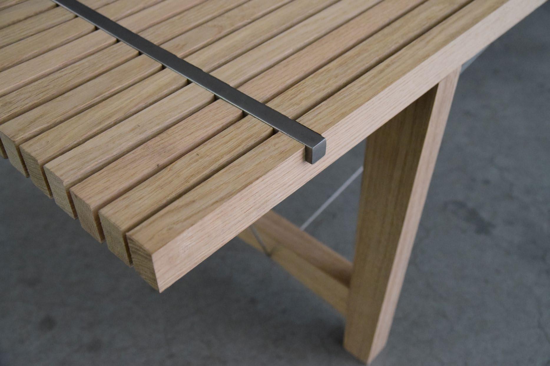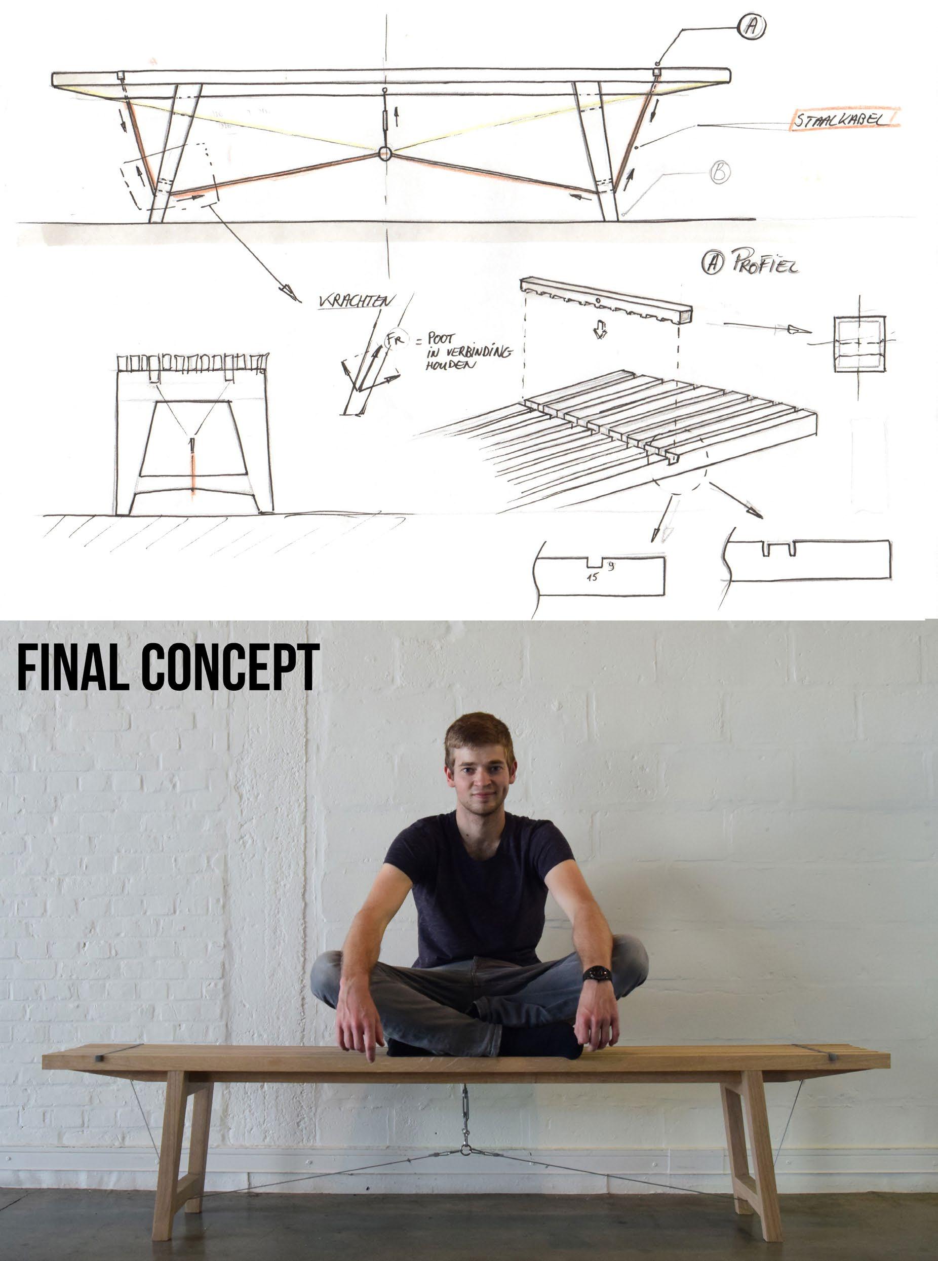 Again, by prototyping nearly every concept that might work I got a clear view of the feasibility of each concept. Finally I developed a bench which consists of two materials to create the tension. The oak parts in the bench absorb the pressure forces. On the other hand, the stainless steel profiles, steel cables and tensioners create the tensile forces. Moreover, sitting on the bench ensures that the structure will be tightened harder.