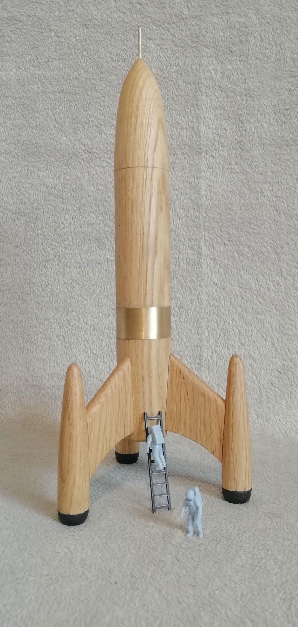 Wooden rocket made out of Oak with messing finish and 3D printed astronauts
