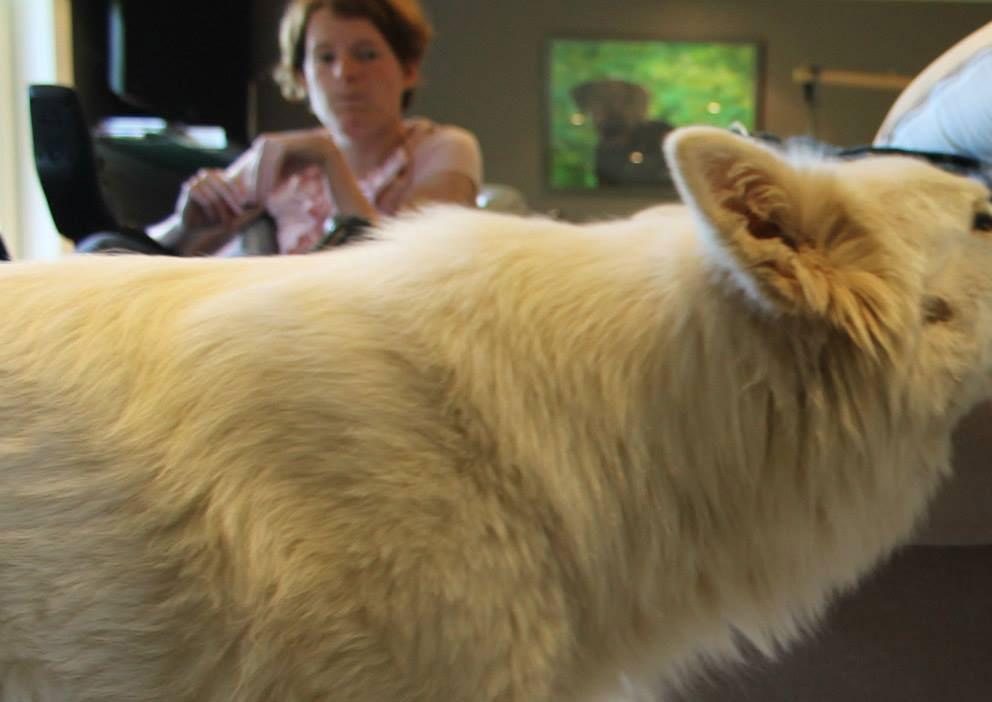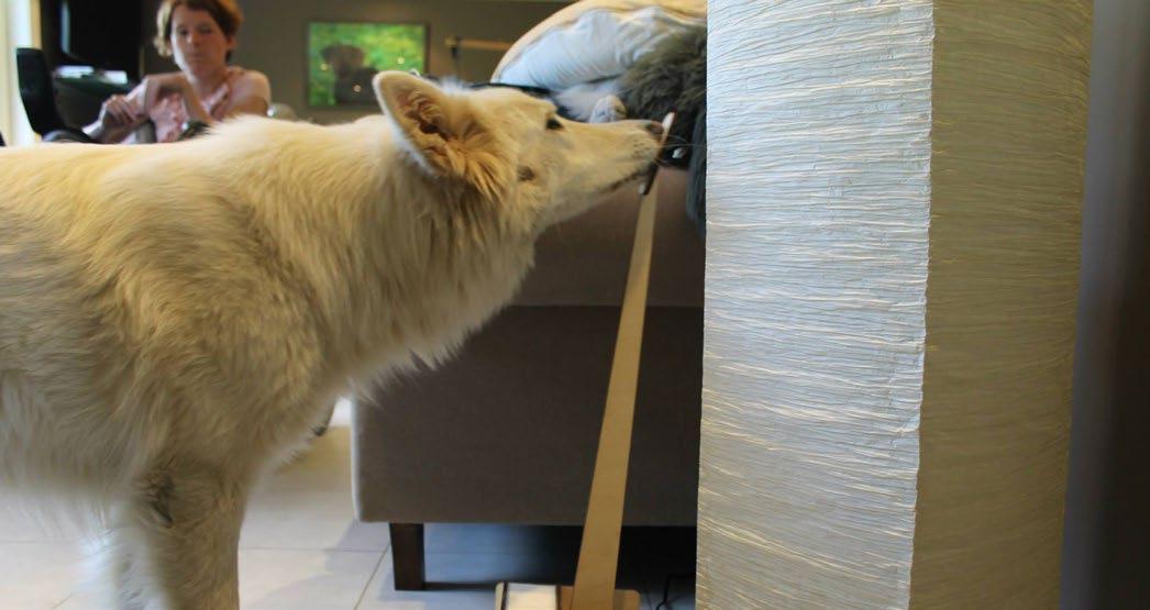 Gyproc is a very smart, studious white shepherd . She quickly picks up new commands . One of her characteristics is that she is very careful. For her it was not possible to press the floor switch because it was too hard to push.