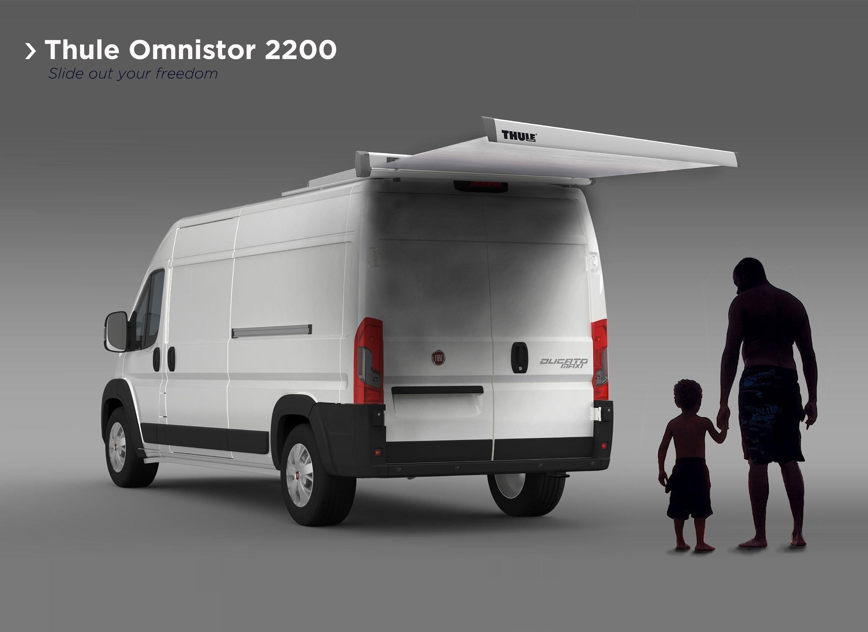 The Thule Omnistor 2200 is an awning especially designed for the back of vans with side doors. It protects campers, sportsman and even contractors against rain and sun while using the van. The strengths of this design are the simplicity and the speed that the awning can be opened and closed with, as well as the feeling of freedom provided by the self-supporting structure. Moreover, the possibility to install the awning on multiple vehicles makes it unique in its context.