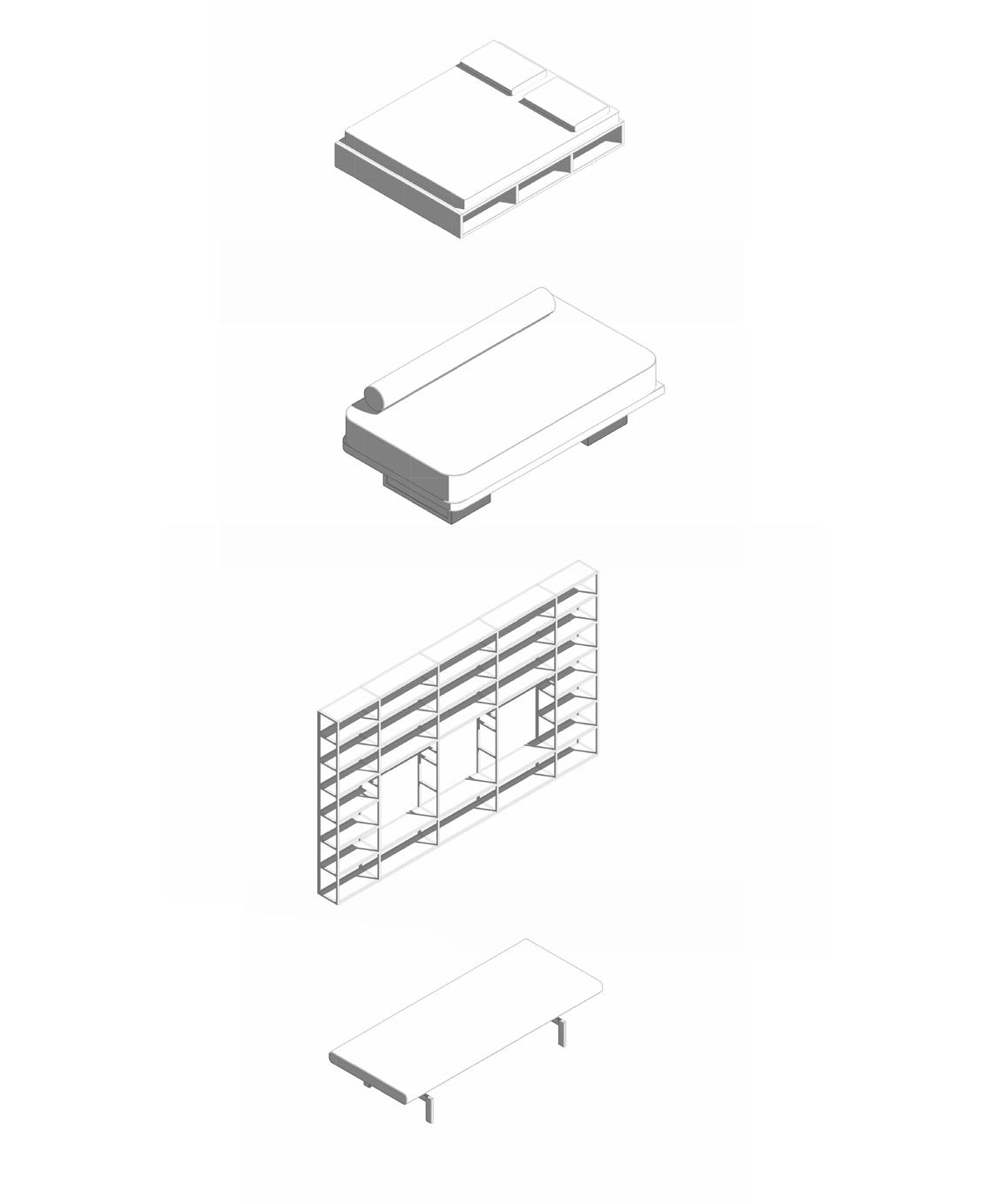 Axonometric: Inner pieces used to create a transformative and interchangeable design