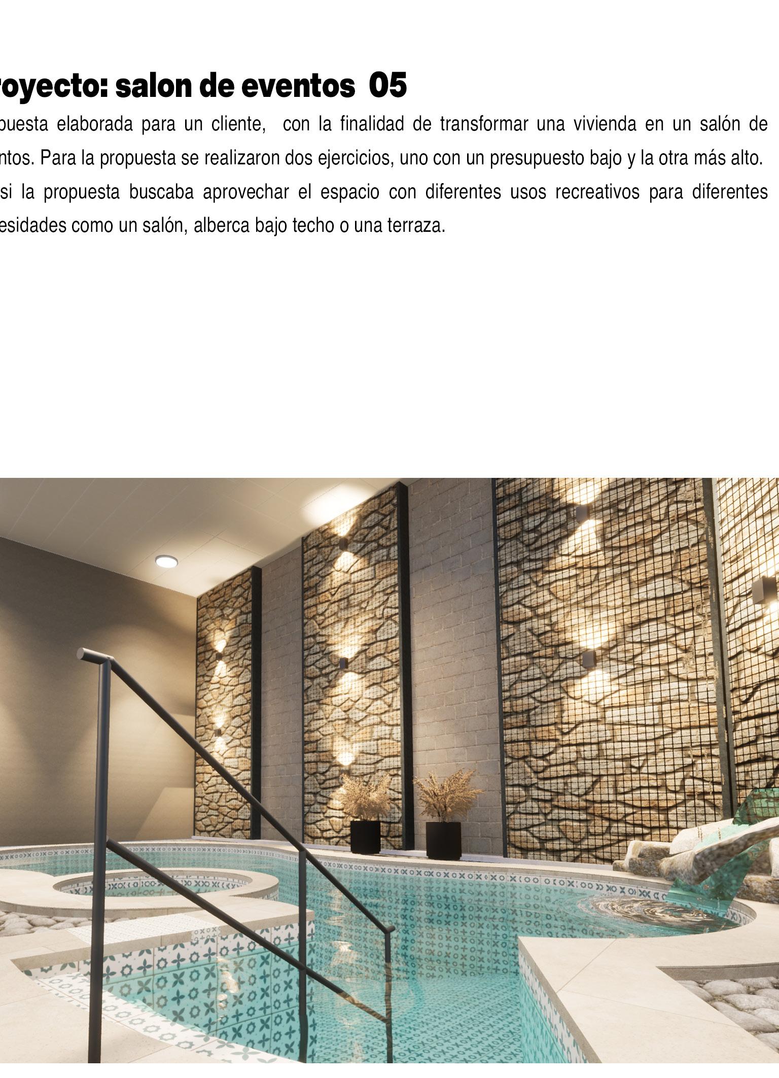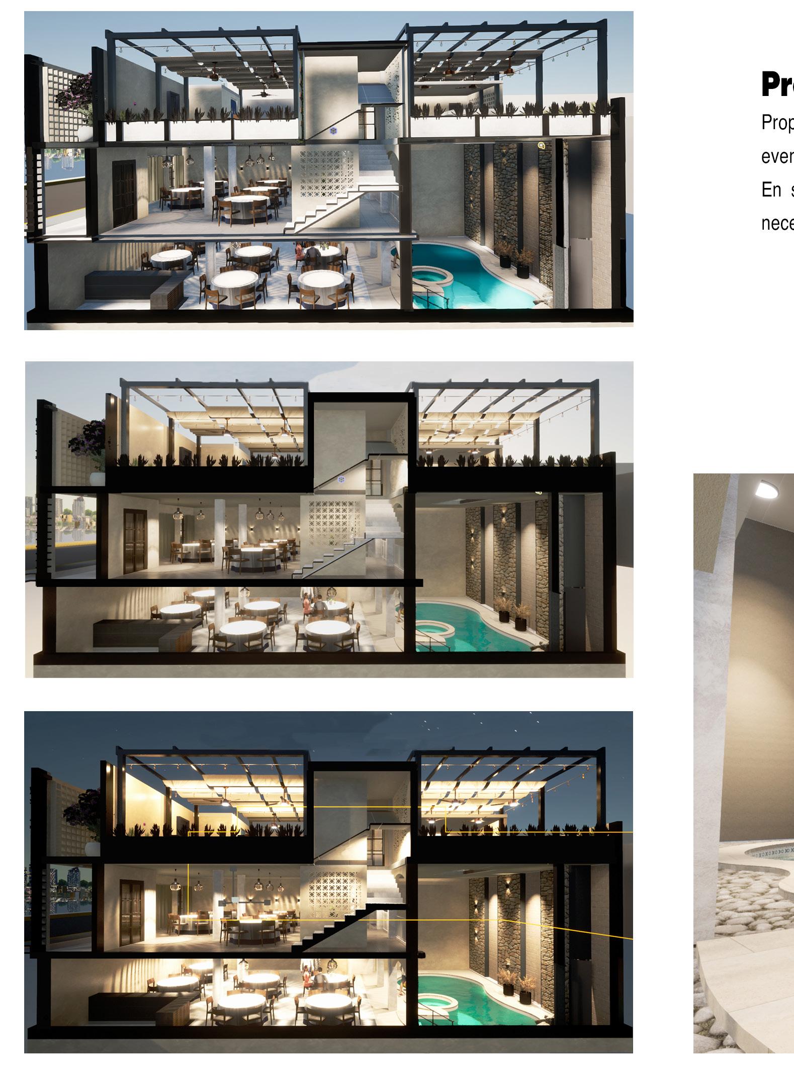 El diseño del salón de eventos surge a partir de la solicitud de mi empleador de crear un espacio versátil y funcional en uno de los terrenos aledaños, capaz de adaptarse a diferentes tipos de celebraciones y reuniones. Para ello, se propuso un diseño que integra arquitectura contemporánea, materiales resistentes y una distribución eficiente que optimiza la experiencia de los usuarios.