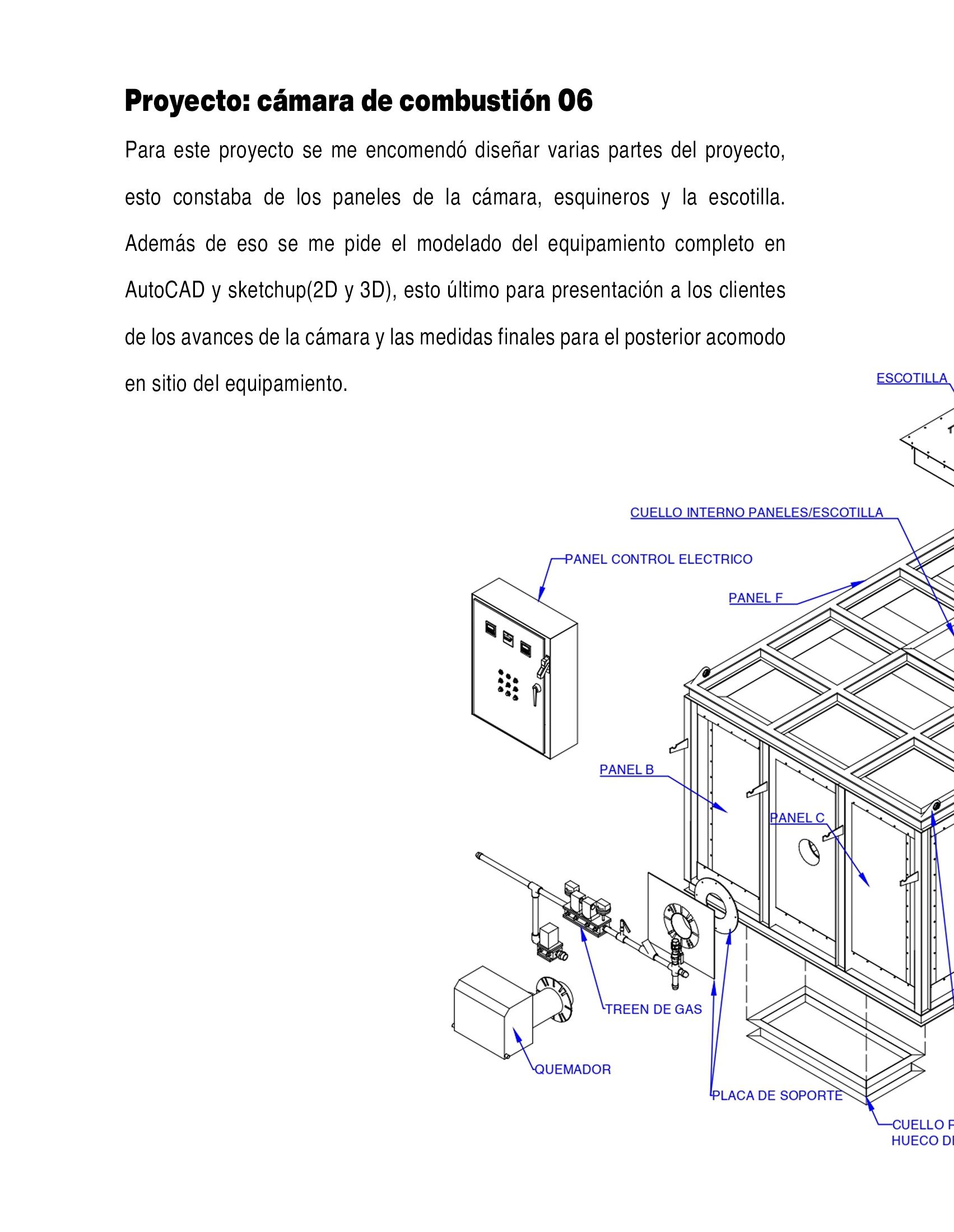 La cámara de combustión fue un proyecto destinado a la fabricación de equipamiento industrial. Su estructura estaba compuesta por vigas IPR y paneles tipo sándwich, diseñados y fabricados a medida.