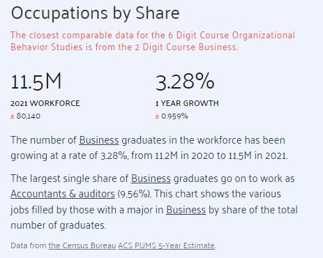 The field of organisational behaviour studies continues to expand with the increasing occupational share. The number of business graduates has been constantly growing at 3.28%, from 11.2M in 2020 to 11.5M in 2021, as per the reports of Data USA