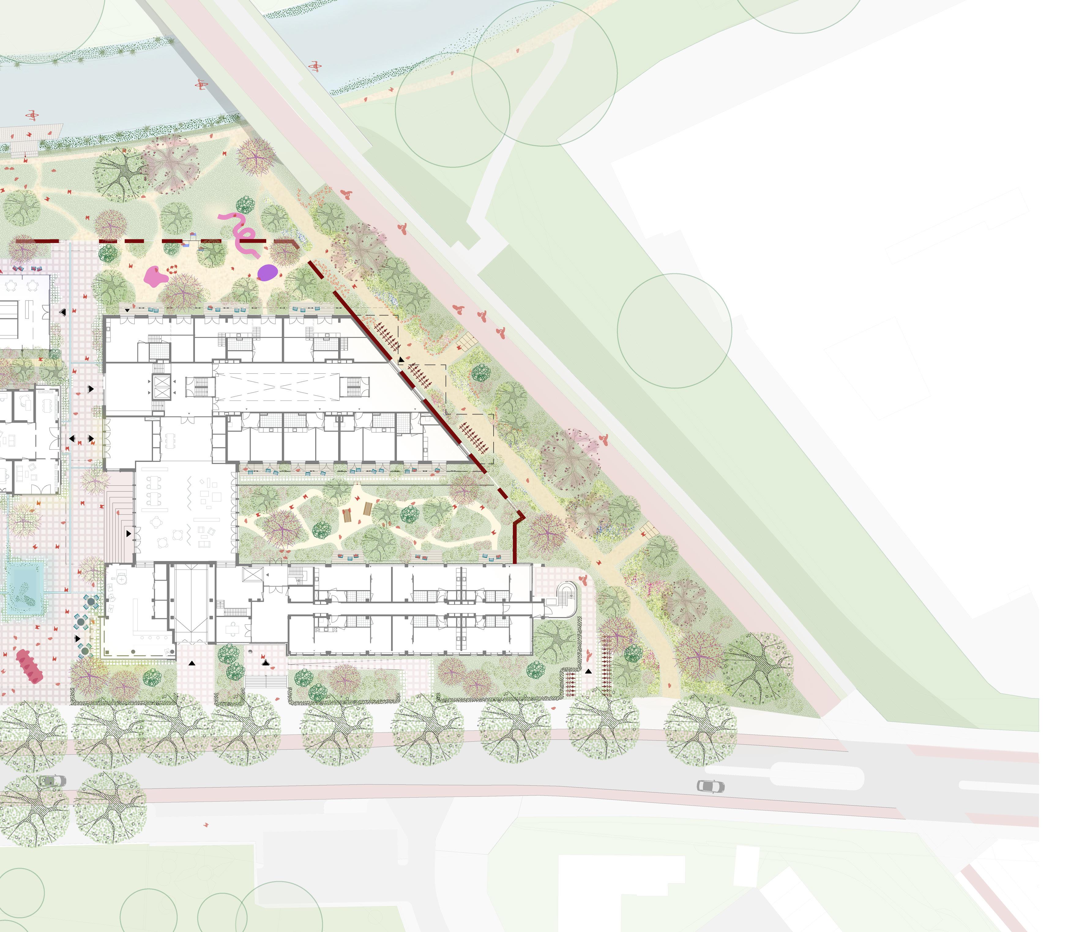 An old mental hospital which is being renovated into living and working spces. Callbacks to the old functions of the zones were reimagined creating updated versions of these old zones. There are living quaters with a semipublic garden. an entrance with an integrated water feature which solves drainage problems. A recreation zone, sport zone and a semi permiable membrane in the form of the old wall. This wall connects the zones of the site as well as defining it.