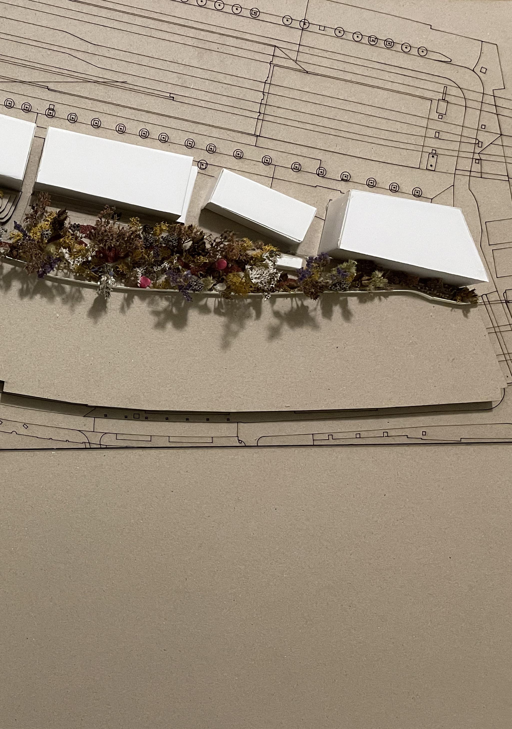 A rooftop garden surrounded by residential buildings. The pathway connects all of the buildings and important enterances leading the user through the waves of plants. The planting is made up of mostly edible plants whcih grow at various heights. The heights are used to create the waves and as the user walks through from all angles the waves can be experienced.