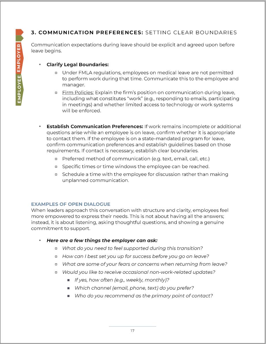 SCOPE: These guidelines focus on caregiving leave. Other forms of leave (e.g., medical, mental health, or personal transitions such as divorce) may require additional considerations. Firms should review existing benefits and confirm compliance with state and federal leave requirements.