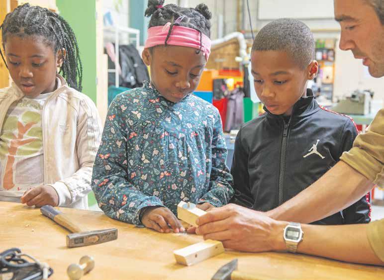 Het technieklokaal is geen gewoon klaslokaal. In het lokaal staan 3D-printers en hangen zagen en schroevendraaiers aan de muur. Paulina (10) werkt het liefst met een hamer. ‘Ik werk graag met mijn handen. Ik voel me ontspannen als ik met mijn handen werk’, zegt ze.