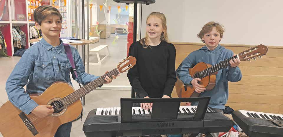 ‘Sommige liedjes hebben een heel snel tempo. Ik leer om sneller met mijn vingers te spelen op de gitaar’, vertelt Simon (10). ‘Ik speel samen met een klasgenoot op 1 piano. We spelen allebei de helft van een muziekstuk’, vertelt Juliette (12). ‘We leren ook muziek maken met ons lichaam. Dat heet bodypercussie. We stampen en klappen op een ritme’, vertelt Laurens (11).