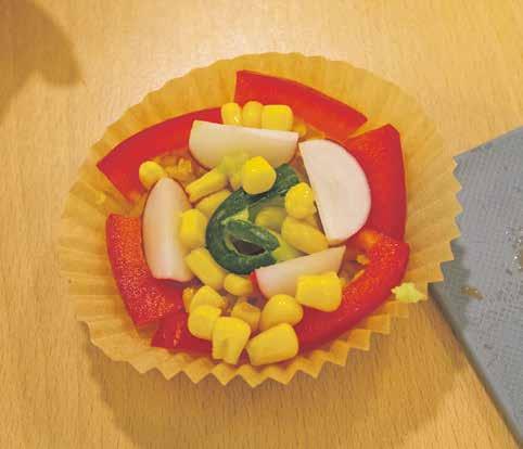‘We versieren de bakjes rijst met de gesneden groenten, het gesneden fruit en een stukje zalm’, vertelt Anniek (10). Elif (10): ‘We maken een soort taartjes van rijst, groenten, fruit en vis.’ Olivier (10) versiert zijn sushicup met maïs, komkommer en paprika. ‘Ik vind het leuk om zelf te bepalen hoe mijn gerecht eruitziet’, zegt Olivier. Koray (10): ‘Ik leg de groenten heel netjes op de rijst. Ik vind dat mijn sushicup er daardoor heel mooi uitziet.’ ‘Het versieren van een gerecht noem je garneren’, vertelt kok Eltjo. Tim (10) proeft zijn sushicup. ‘Ik vind mijn sushicup heel lekker smaken.’