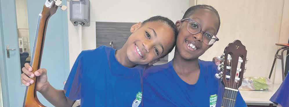 Gitaar leren spelen Kehlany en Faith-Lynn vinden het leuk om gitaar te leren spelen. Kehlany: ‘Ik kan na deze les beter gitaar spelen. Ik heb geleerd dat ik mijn vingers langs de snaren moet laten glijden. De snaren zijn de draden van de gitaar.’ Faith-Lynn: ‘Ik heb geleerd wat het verschil is tussen de dikke en de dunne snaren. Dikke snaren maken lage tonen en dunne snaren maken hoge tonen.’