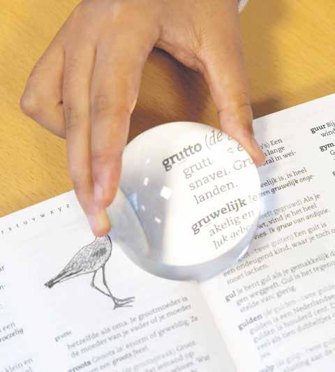 ‘Ik heb op school hulpmiddelen. Hulpmiddelen zijn dingen die je gebruikt om iets gemakkelijker te kunnen doen. Ik heb bijvoorbeeld een speciale tafel. Ik kan mijn tafel omhoog zetten zodat de spullen op mijn tafel dichter bij mijn gezicht liggen. Ik kan de spullen daardoor beter zien. Ik heb ook een vergrootglas. Ik gebruik mijn vergrootglas als ik kleine letters wil lezen. Ik gebruik in de klas soms ook een speciale computer om teksten te vergroten. Ik heb in de klas ook een iPad waarop ik teksten kan lezen en opdrachten kan maken. Ik kan op mijn iPad makkelijk letters vergroten als ik iets niet kan lezen’, vertelt Sudem.