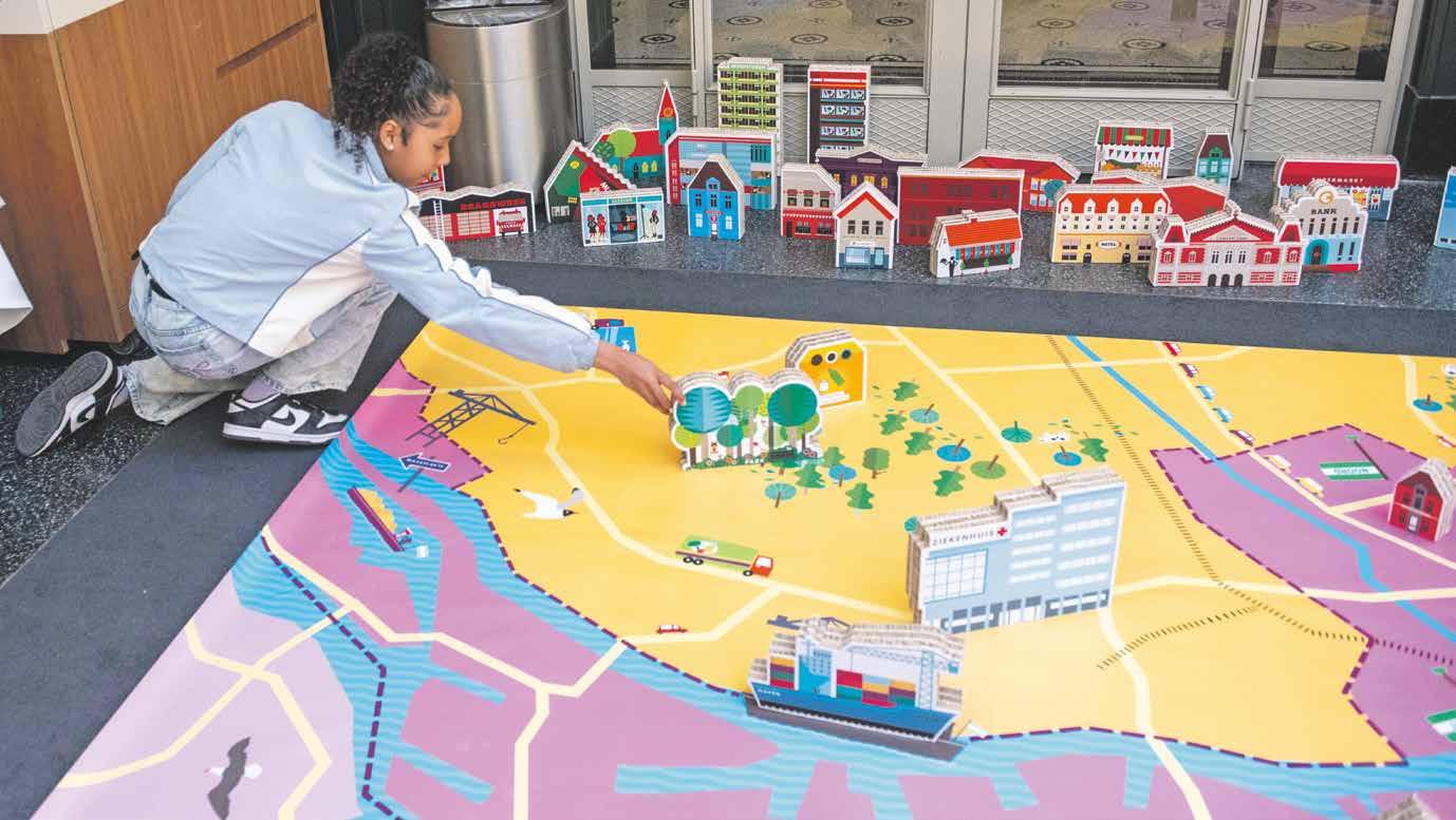 De leerlingen kiezen voorzieningen voor hun denkbeeldige stad en plaatsen de gekozen voorzieningen op de plattegrond. Foto’s: Arjen Jan Stada