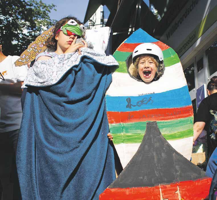 ‘Ik ga vaak met de metro naar school. Ik kom vandaag met de fiets’, vertelt Shay (11). Jet (11): ‘Ik kom hockeyend het plein op.’ Loes (8): ‘Ik kom verkleed als raket naar school.’