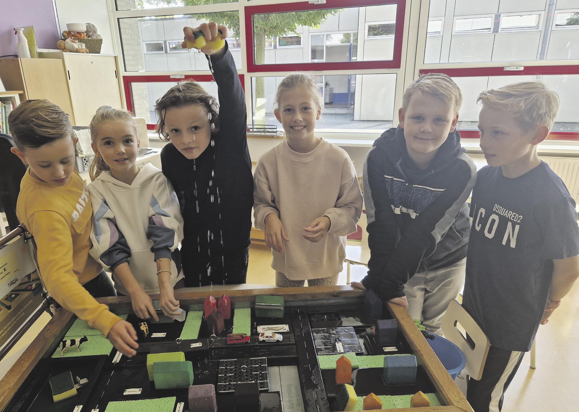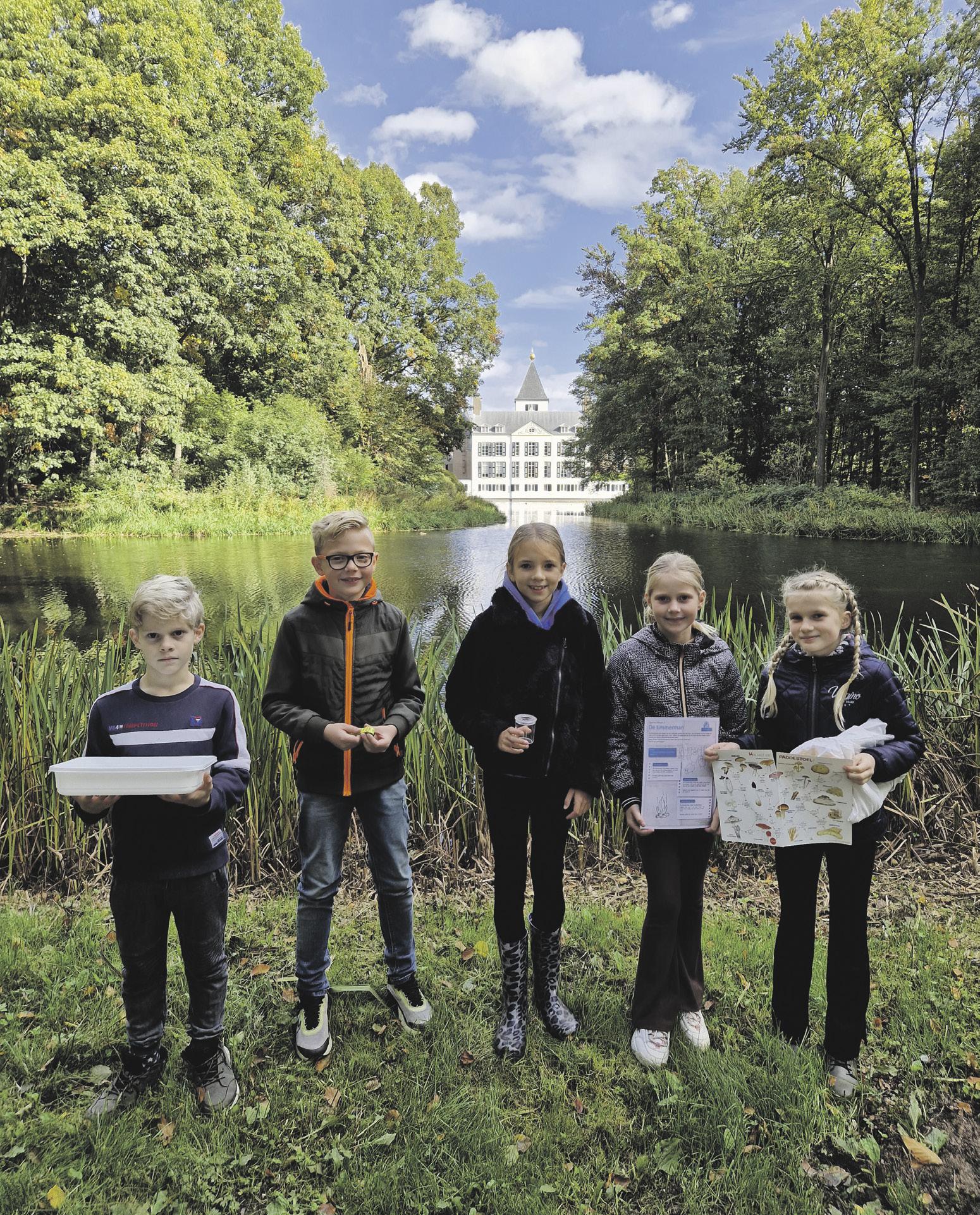 De leerlingen worden begeleid door vrijwil ligers van de groep ‘Van Dassenburcht tot Luchtkasteel’. Ze worden daarvoor eerst in groepjes verdeeld. Ieder groepje gaat met een begeleider op pad. Lynn (9), Lize (9), Jaidy (9), Joey (9) en Evan (9) gaan op pad met Ria.