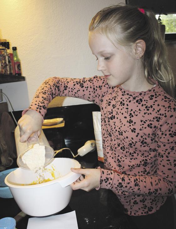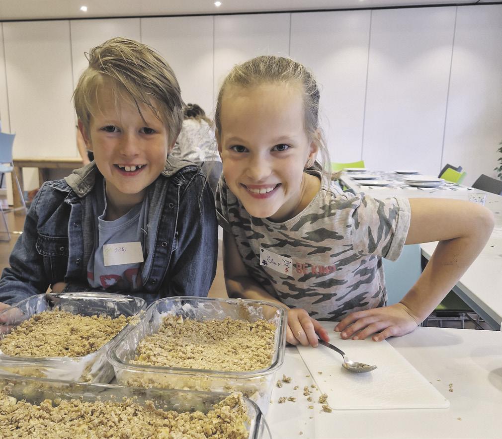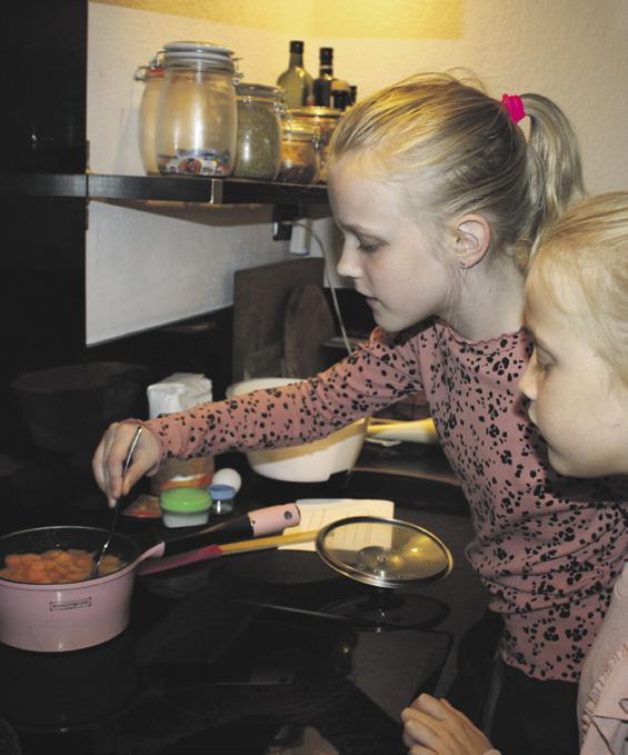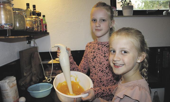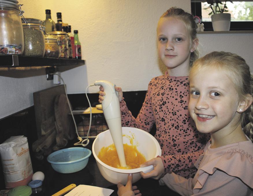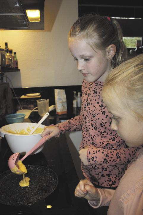 ‘We doen wat olie in de koeken pan. We scheppen daarna met een lepel een beetje pompoenmengsel in de koekenpan’, zegt Elisa. Sofie: ‘We kun nen de pannen koekjes omdraaien als ze aan de rand bruin beginnen te kleuren.’