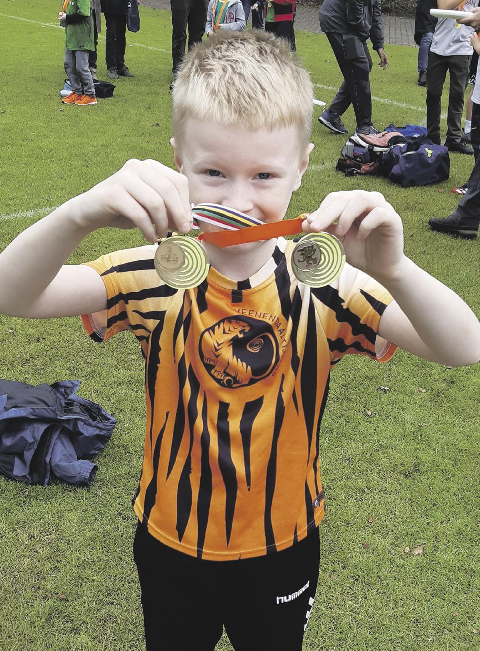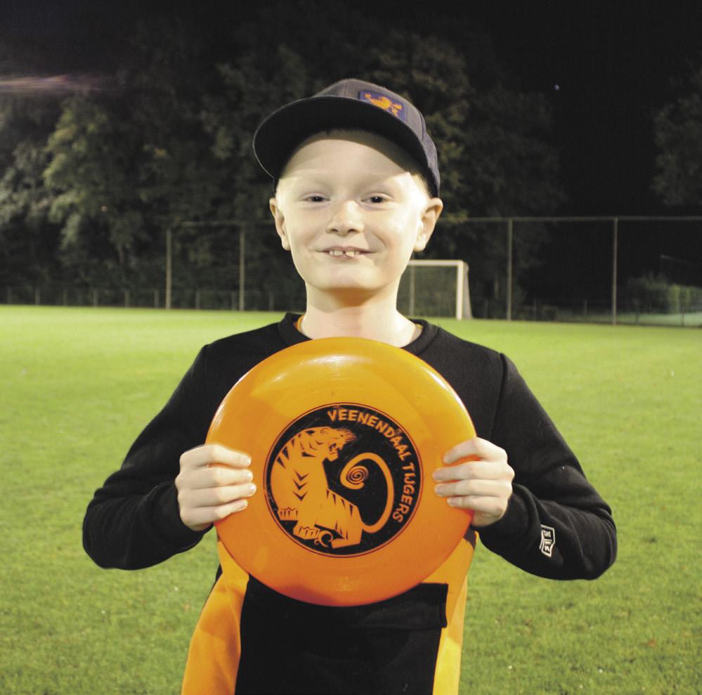 Jeffrey laat zijn gewonnen prijzen zien. Jeffrey in actie met de frisbee.
