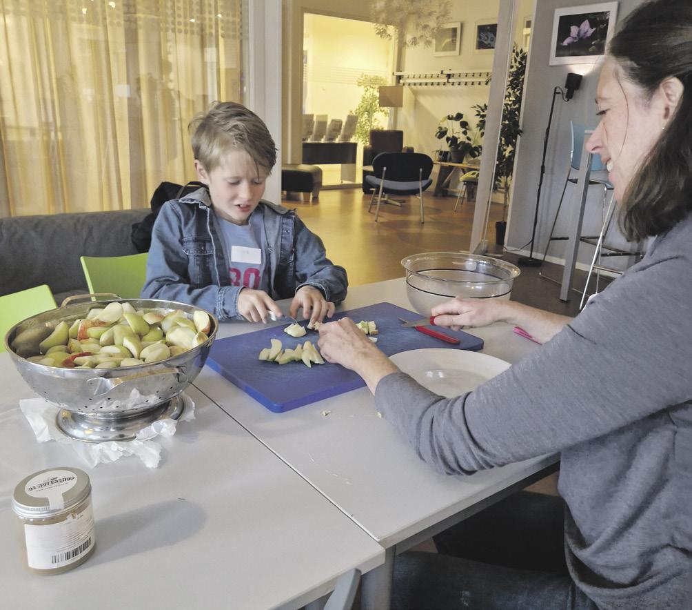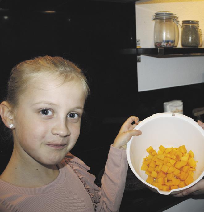 Sofie: ‘We gebruiken kanten-klare pom poenblokjes voor de pannenkoek jes. Je kunt ook een hele pom poen schillen en ontpitten.’ ‘Kant-en-klare pompoenblok jes zijn wel makkelijker’, zegt Elisa.