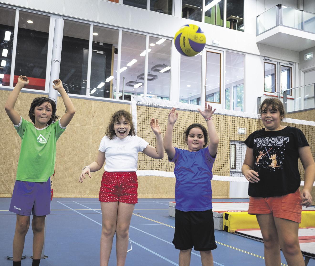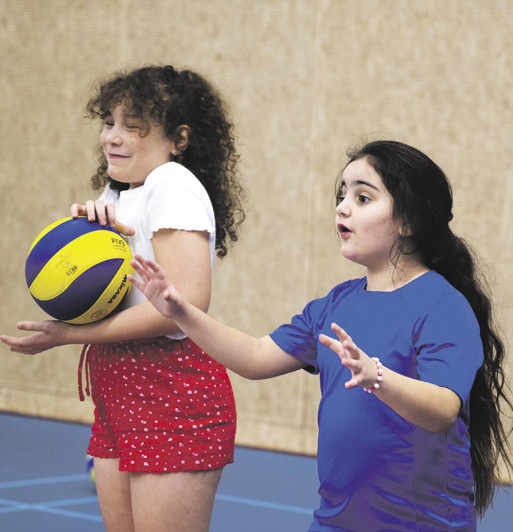 Rafael, Sade, Gamze en Asta gooien de volleybal in de lucht.