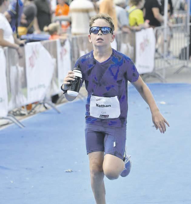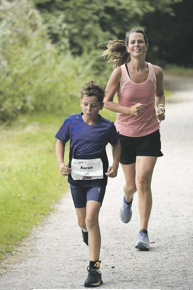 Inspanning en uitputting ‘Ik krijg tijdens het hardlopen wat buikpijn van de inspanning. Het is ook een warme dag. Ik vind het meedoen aan een triatlon wel heel leuk’, zegt Nathan. Aaron: ‘Ik vind de triatlon pure uitputting. Het is zwaar. Ik haal de finish toch. Ik voel me daardoor wel een beetje trots. Ons gezin wandelt, fietst en zwemt best veel. Ik zou toch meer trainen voor een volgende triatlon.’