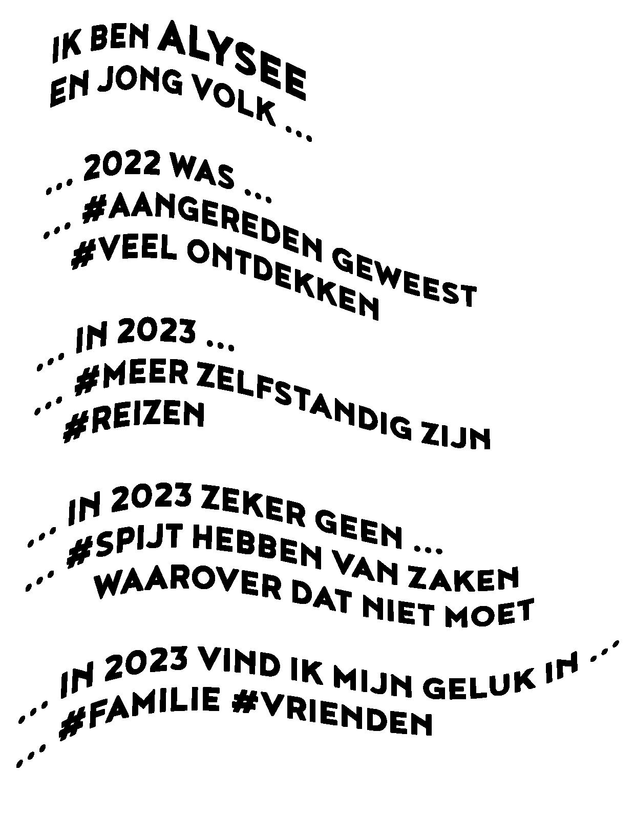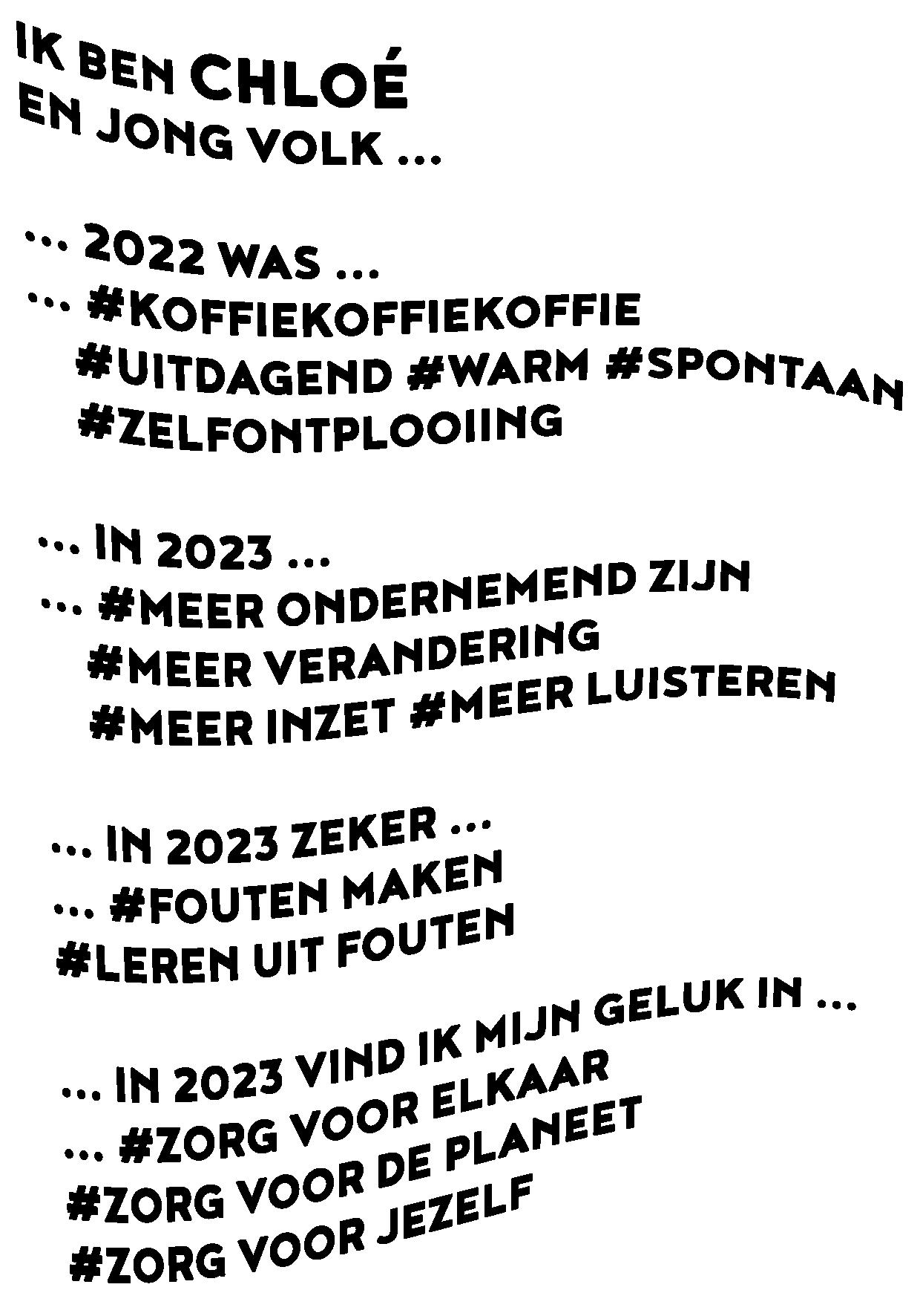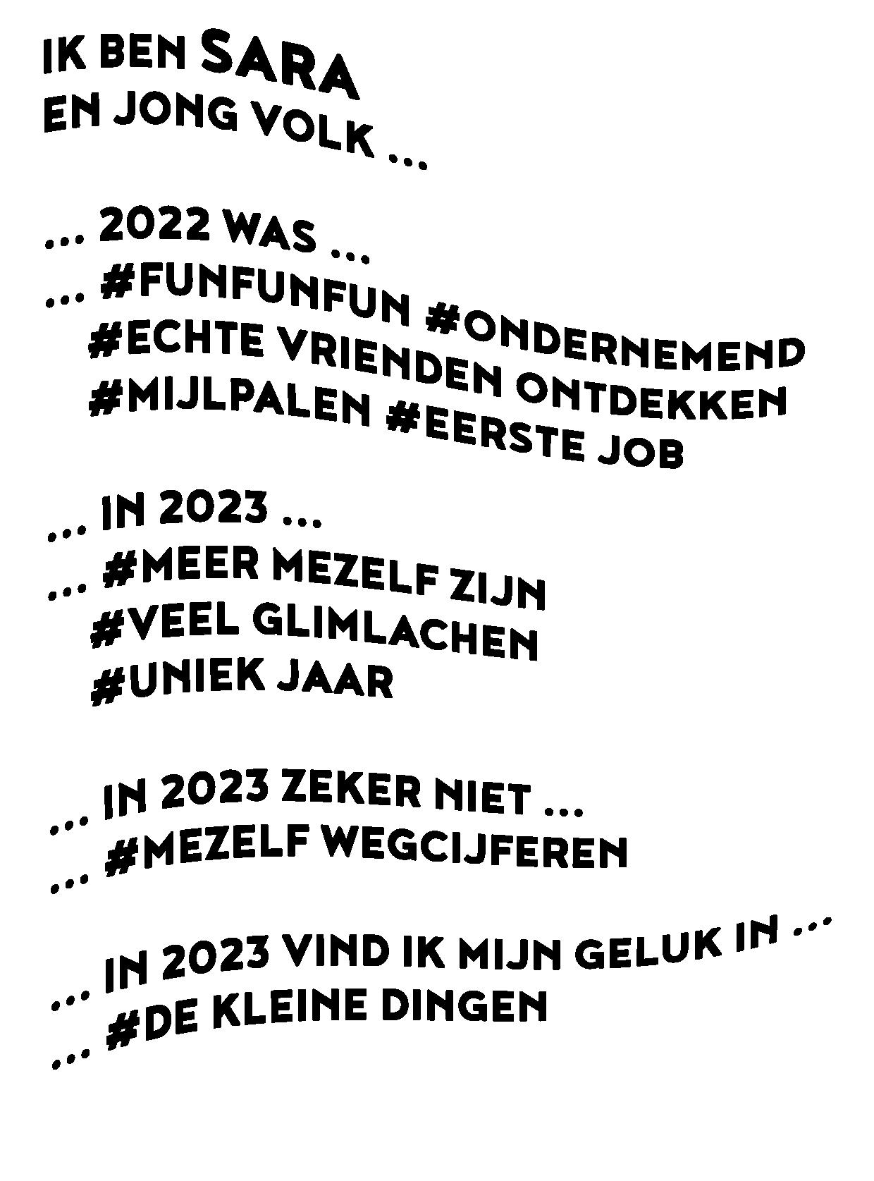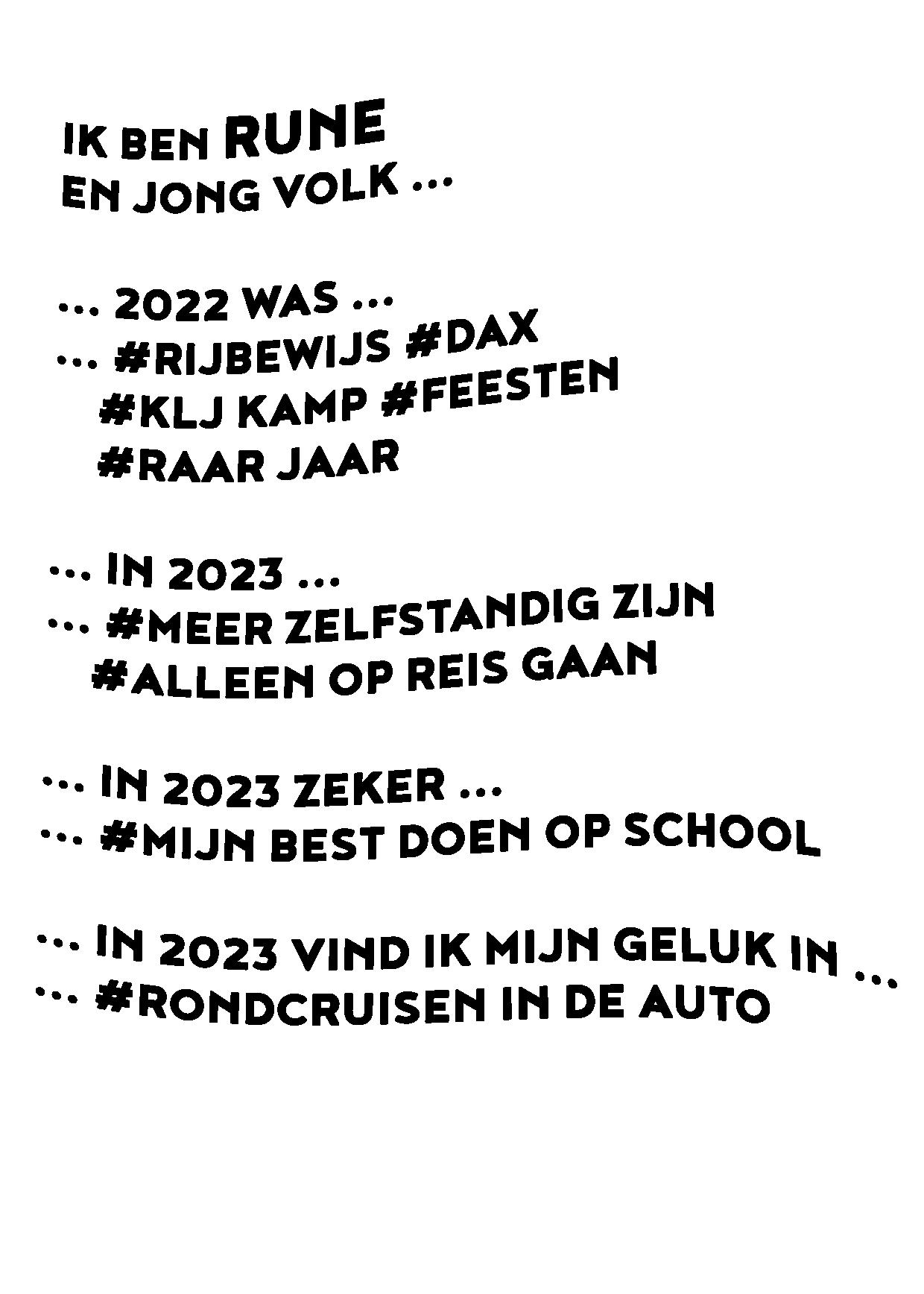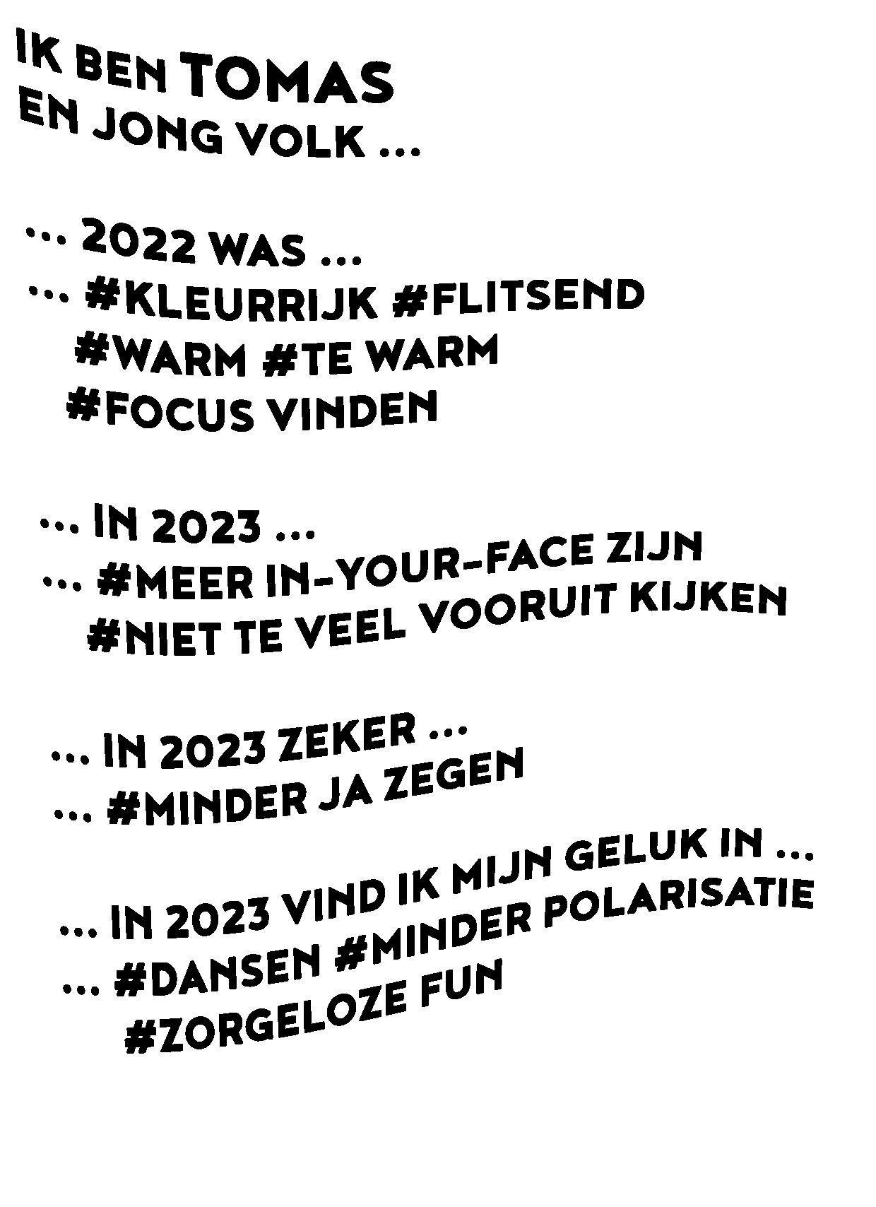 Voor het Jong Volk jaarboek 2022 vertelden 37 jongeren ons ... … hoe ze 2022 beleefden … wat hun favoriete hashtags waren … hun favoriete soundtrack van 2022 … hun strafste verhaal … … wat hun verwachtingen zijn voor 2023 … de grootste fout die ze kunnen maken in 2023 … wat hun idee van ‘geluk’ is in 2023