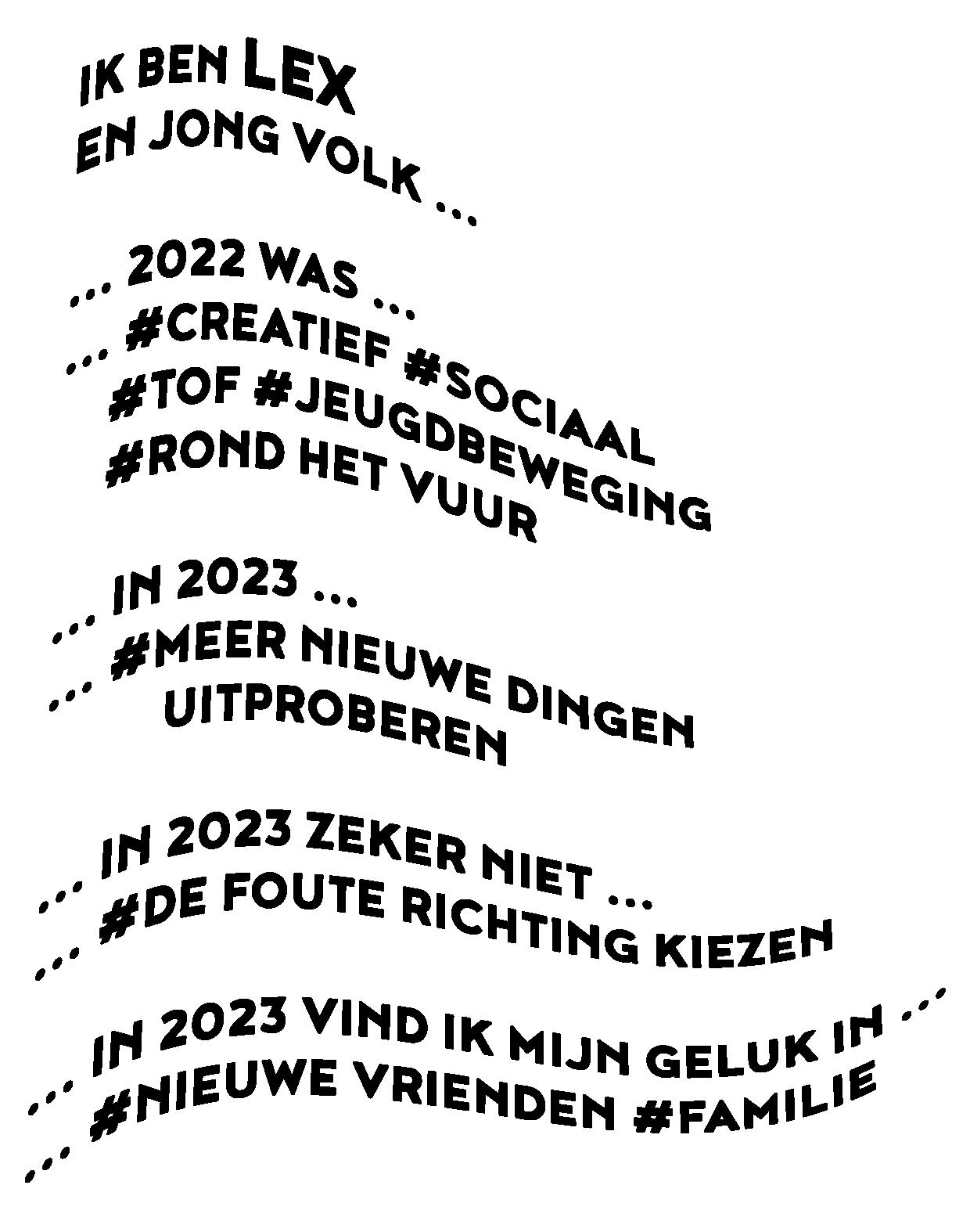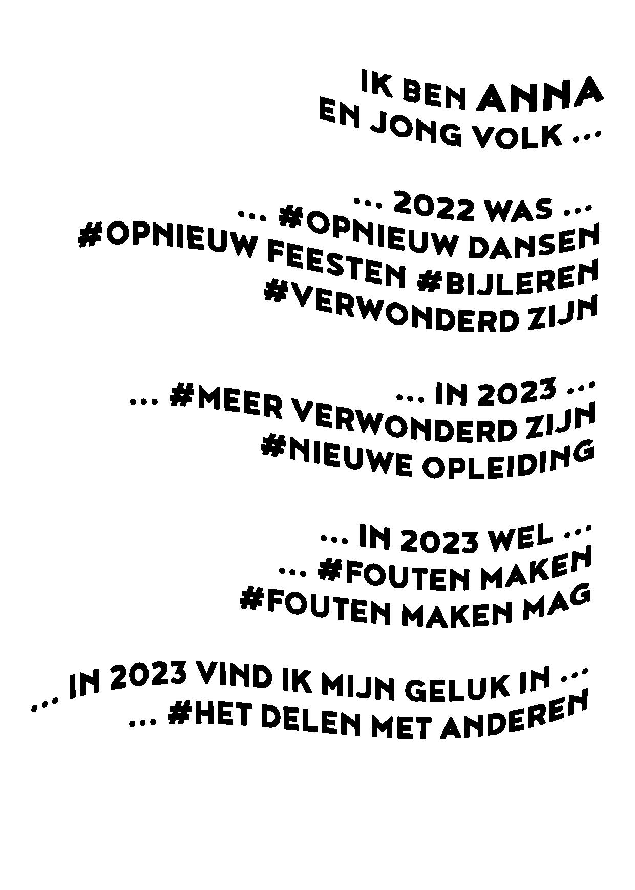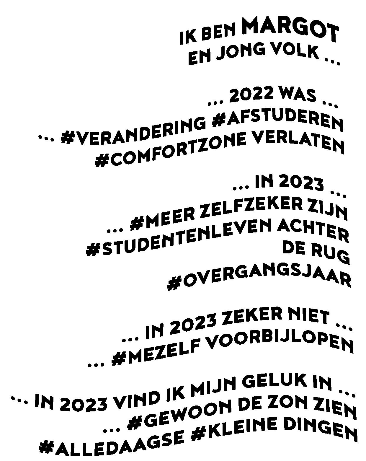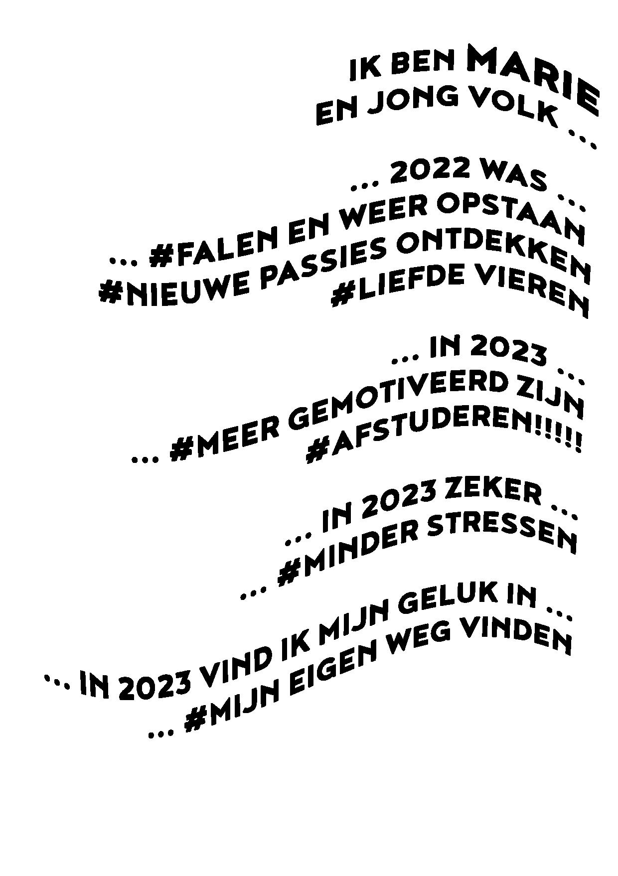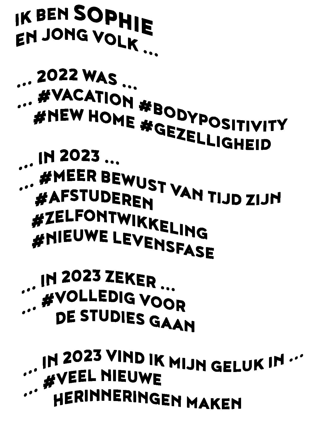 Voor het Jong Volk jaarboek 2022 vertelden 37 jongeren ons ... … hoe ze 2022 beleefden … wat hun favoriete hashtags waren … hun favoriete soundtrack van 2022 … hun strafste verhaal … … wat hun verwachtingen zijn voor 2023 … de grootste fout die ze kunnen maken in 2023 … wat hun idee van ‘geluk’ is in 2023