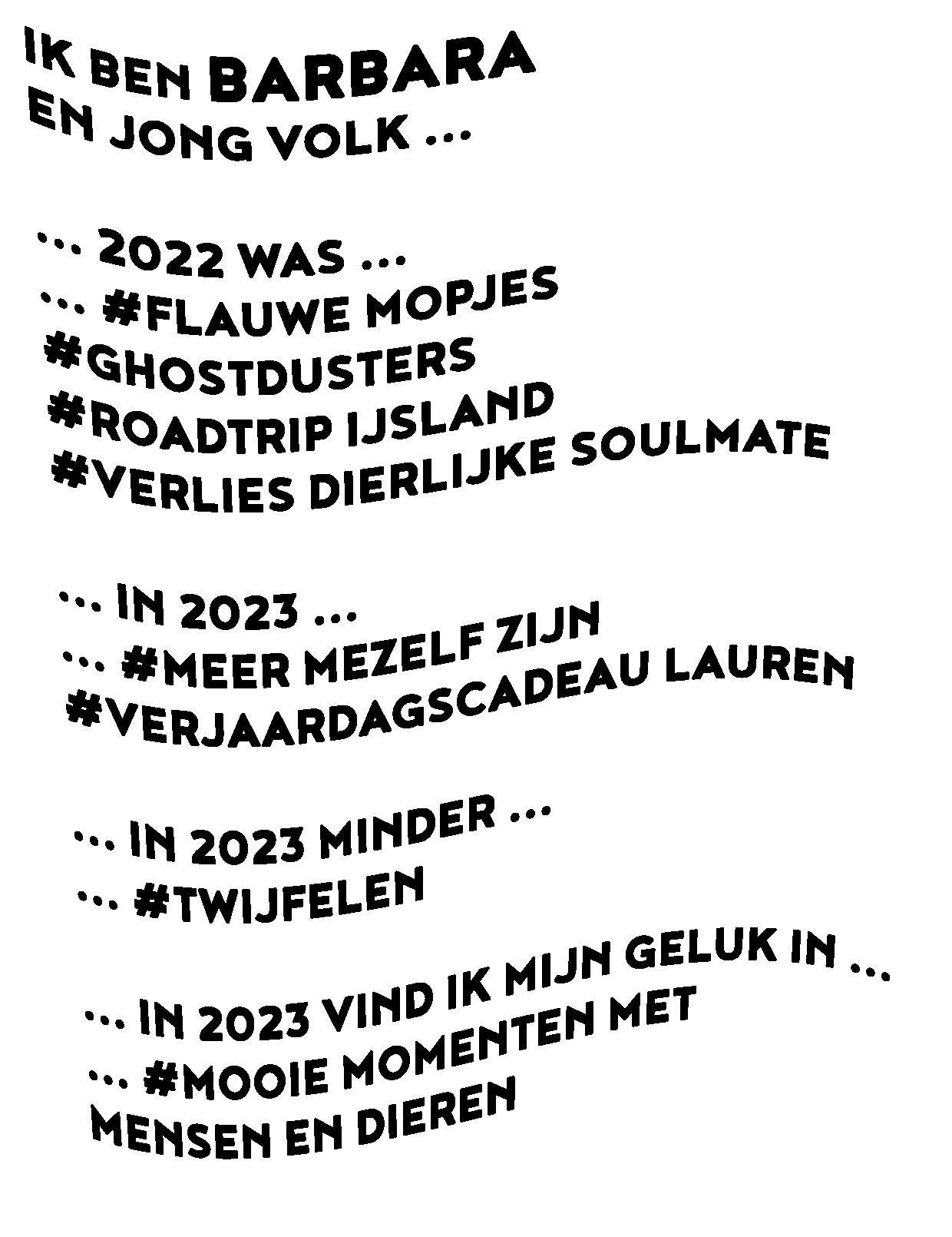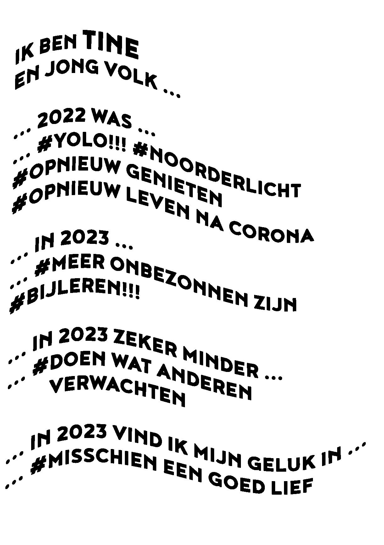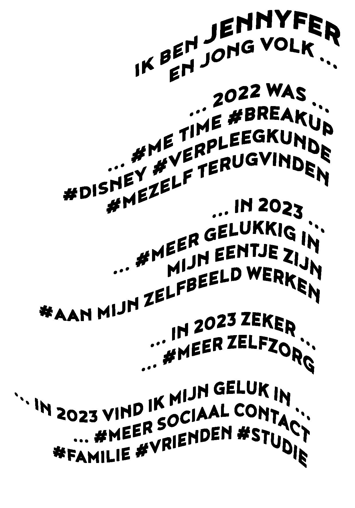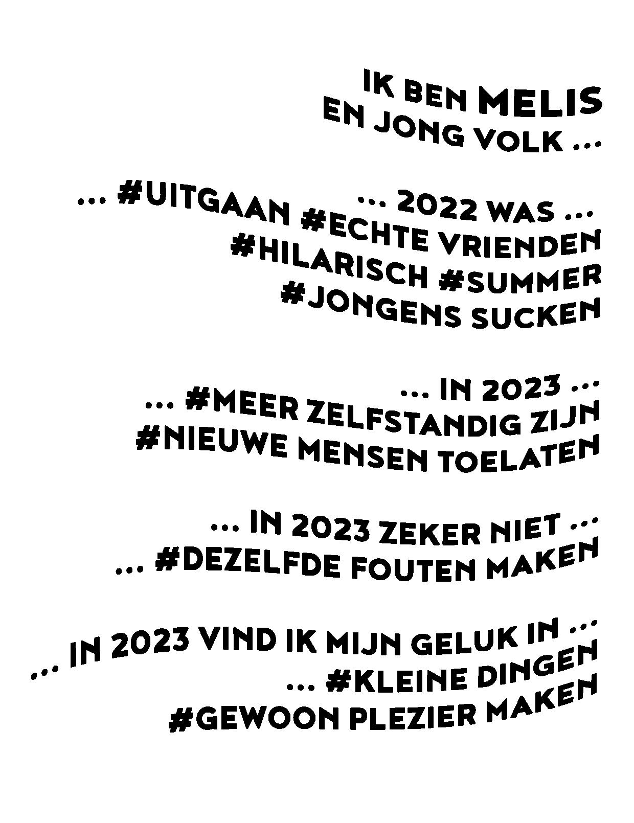 Voor het Jong Volk jaarboek 2022 vertelden 37 jongeren ons ... … hoe ze 2022 beleefden … wat hun favoriete hashtags waren … hun favoriete soundtrack van 2022 … hun strafste verhaal … … wat hun verwachtingen zijn voor 2023 … de grootste fout die ze kunnen maken in 2023 … wat hun idee van ‘geluk’ is in 2023