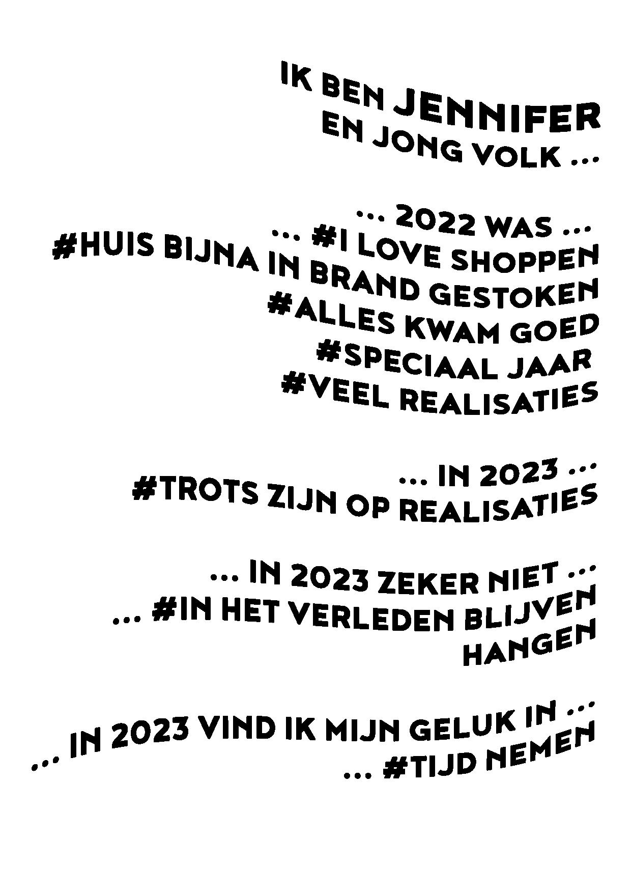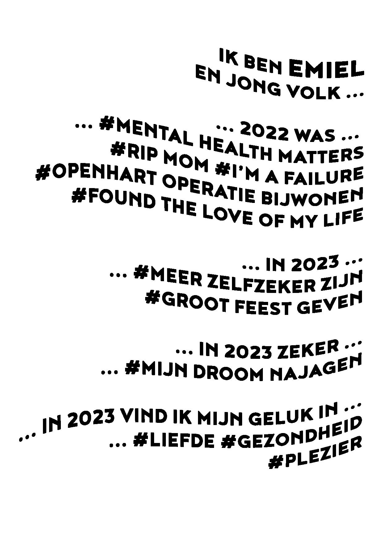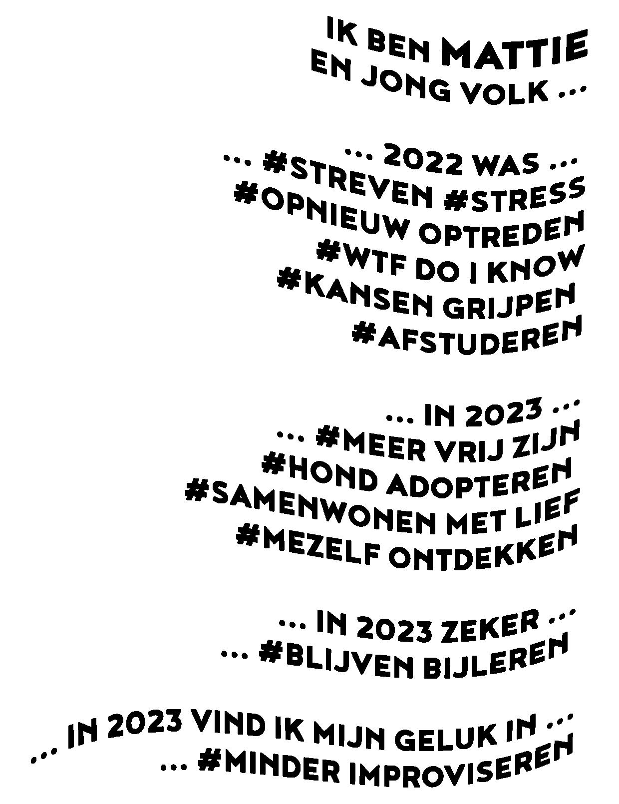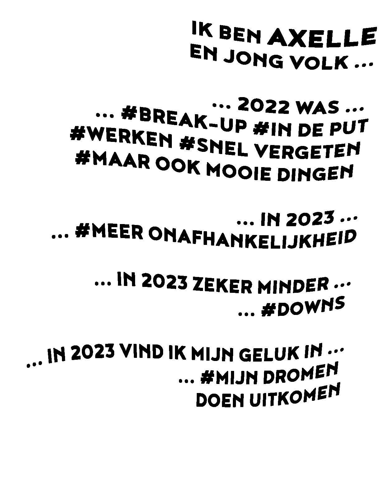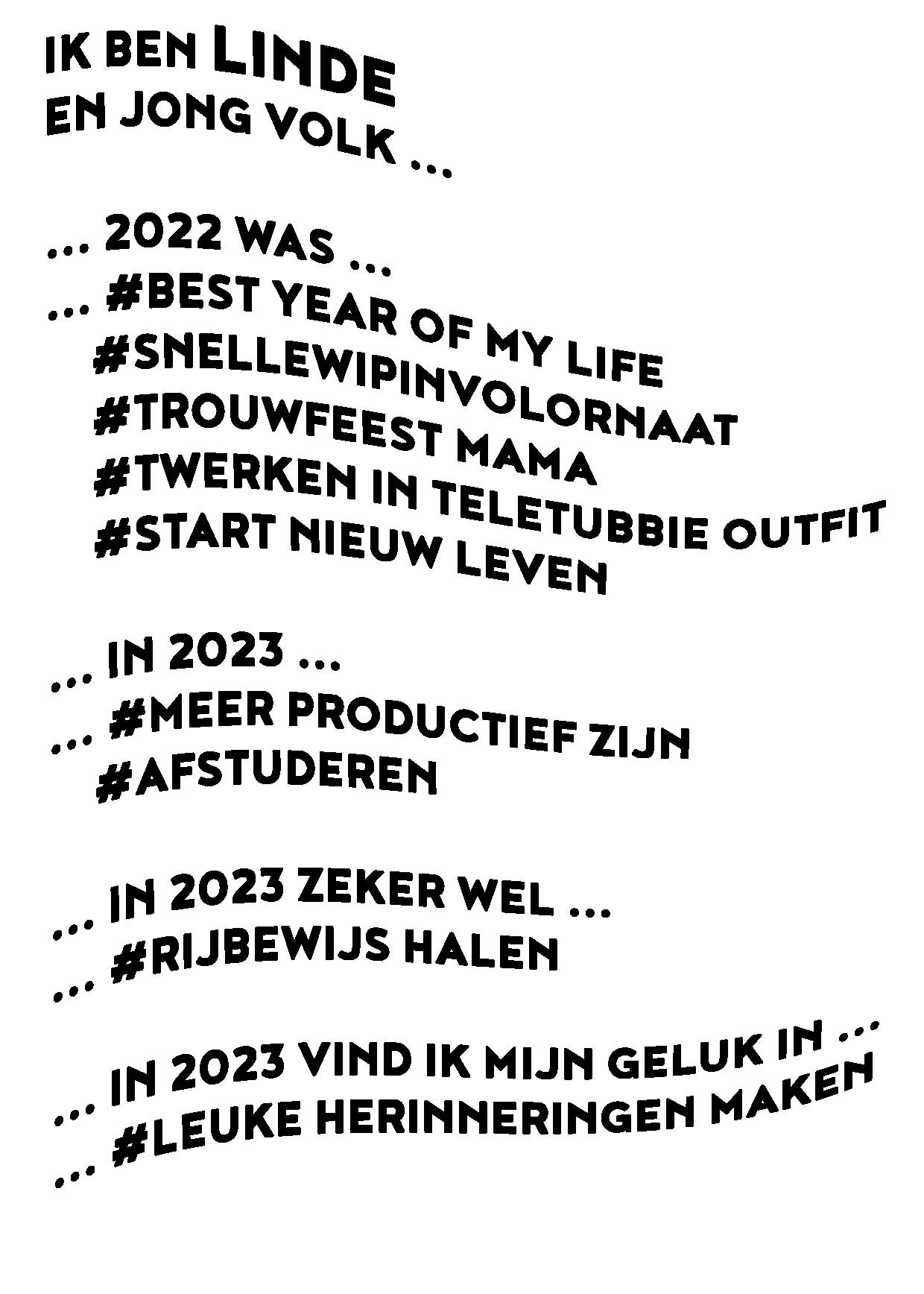 Voor het Jong Volk jaarboek 2022 vertelden 37 jongeren ons ... … hoe ze 2022 beleefden … wat hun favoriete hashtags waren … hun favoriete soundtrack van 2022 … hun strafste verhaal … … wat hun verwachtingen zijn voor 2023 … de grootste fout die ze kunnen maken in 2023 … wat hun idee van ‘geluk’ is in 2023