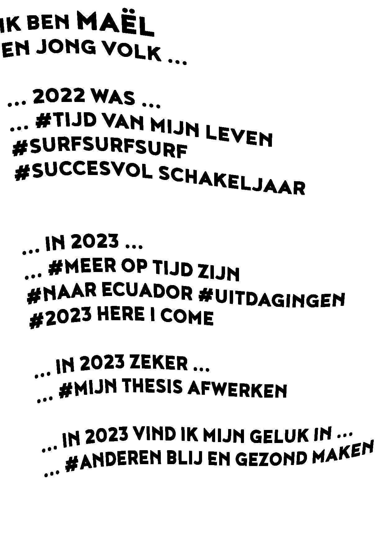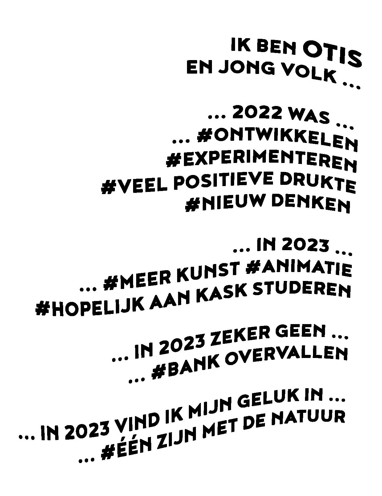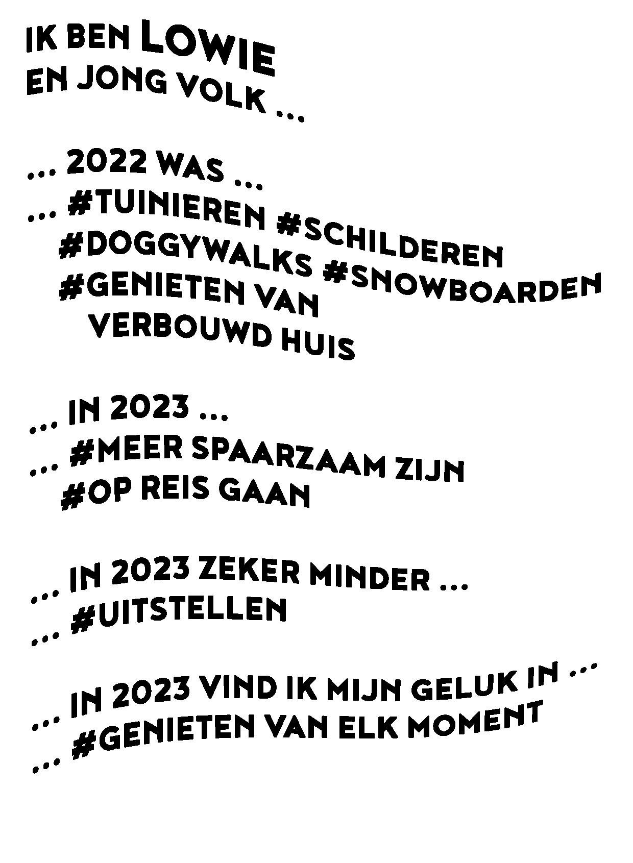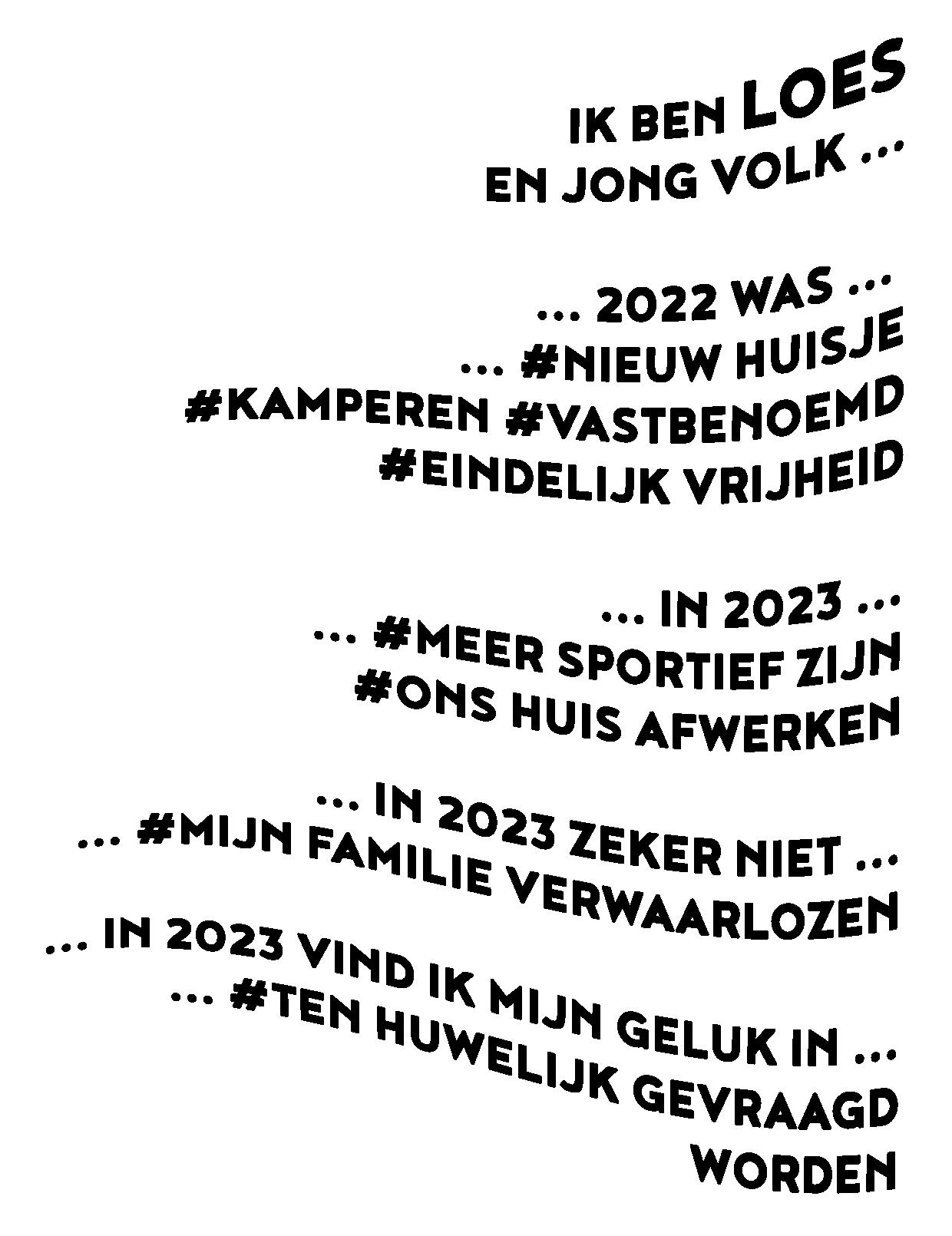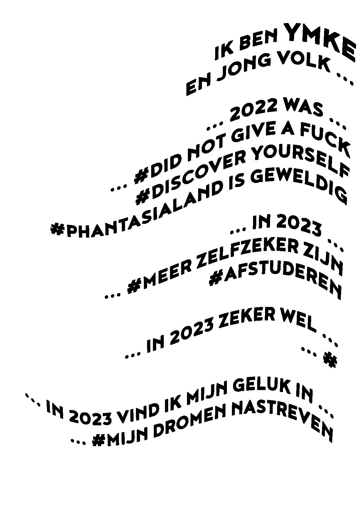 Voor het Jong Volk jaarboek 2022 vertelden 37 jongeren ons ... … hoe ze 2022 beleefden … wat hun favoriete hashtags waren … hun favoriete soundtrack van 2022 … hun strafste verhaal … … wat hun verwachtingen zijn voor 2023 … de grootste fout die ze kunnen maken in 2023 … wat hun idee van ‘geluk’ is in 2023