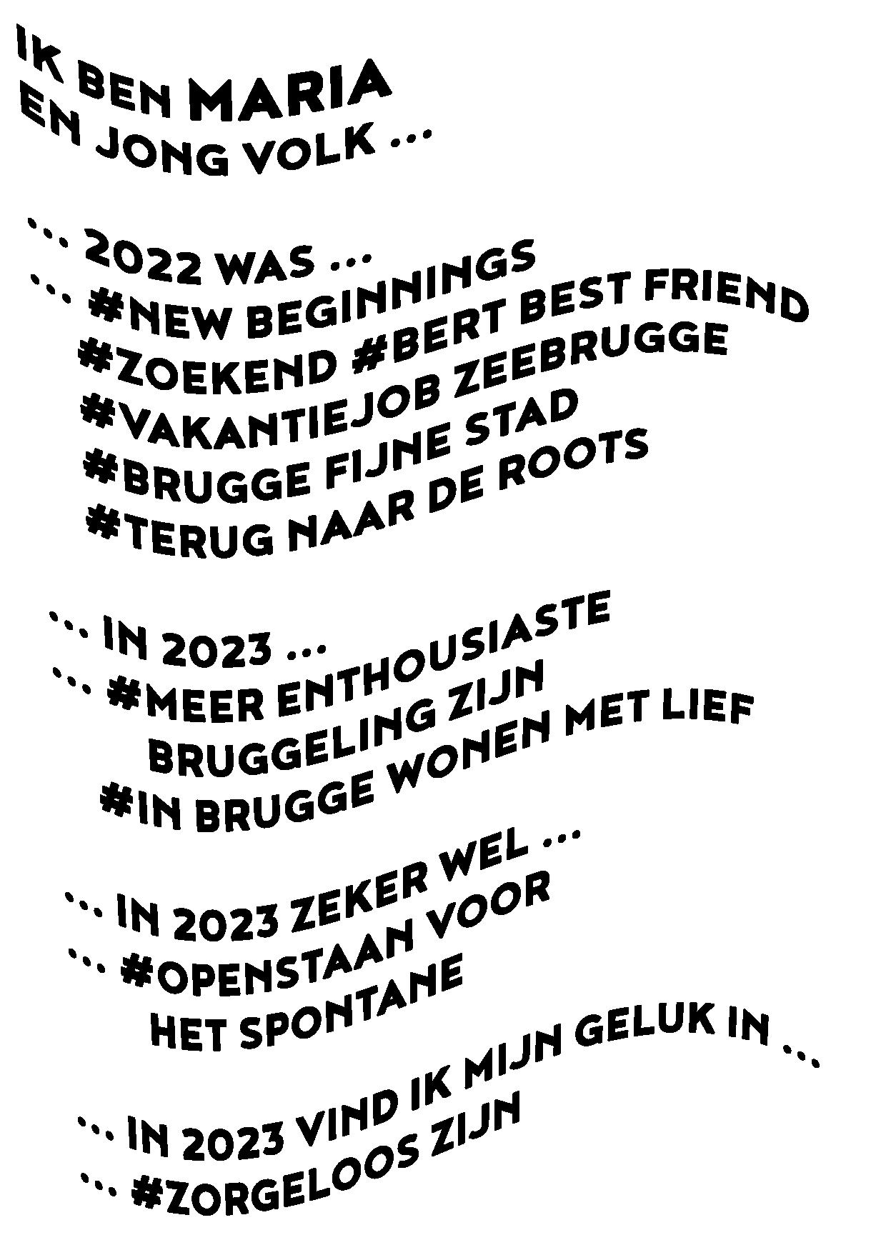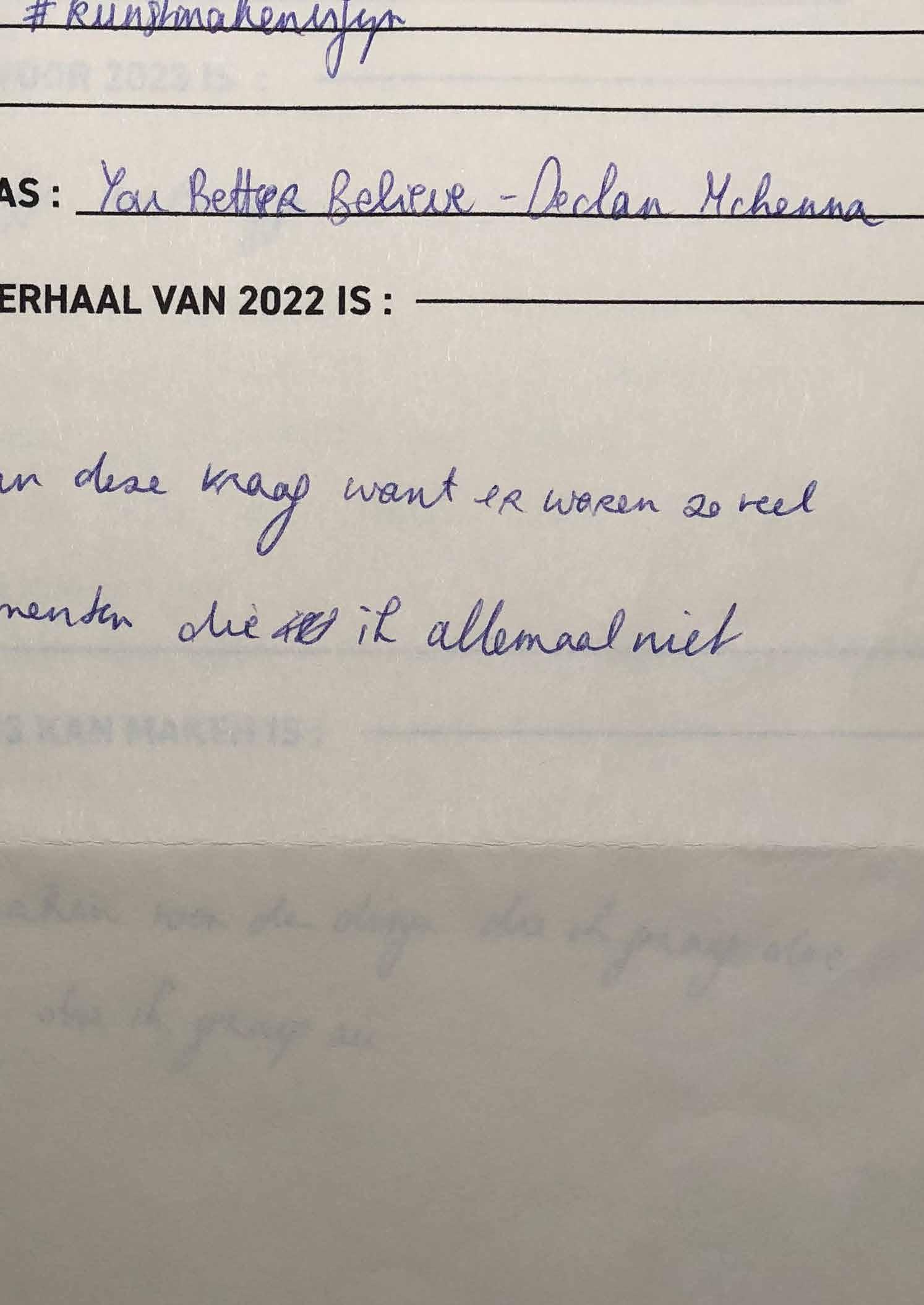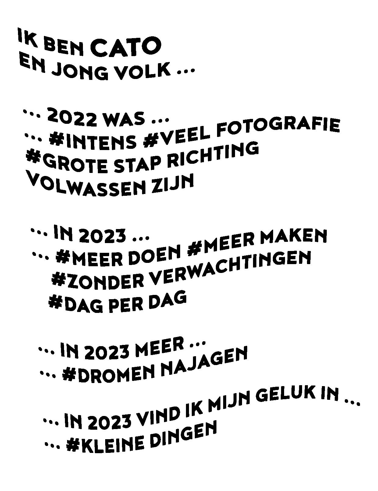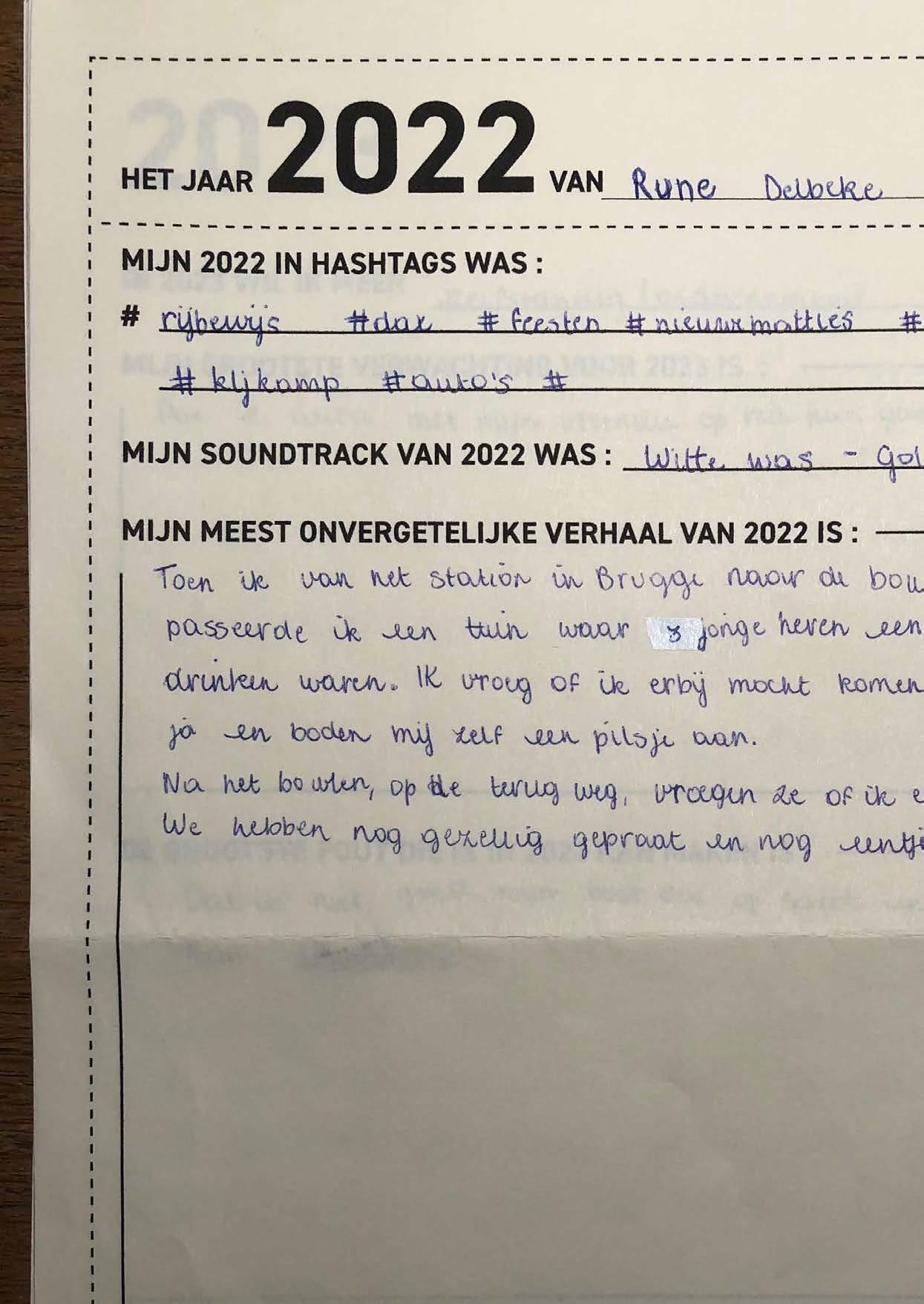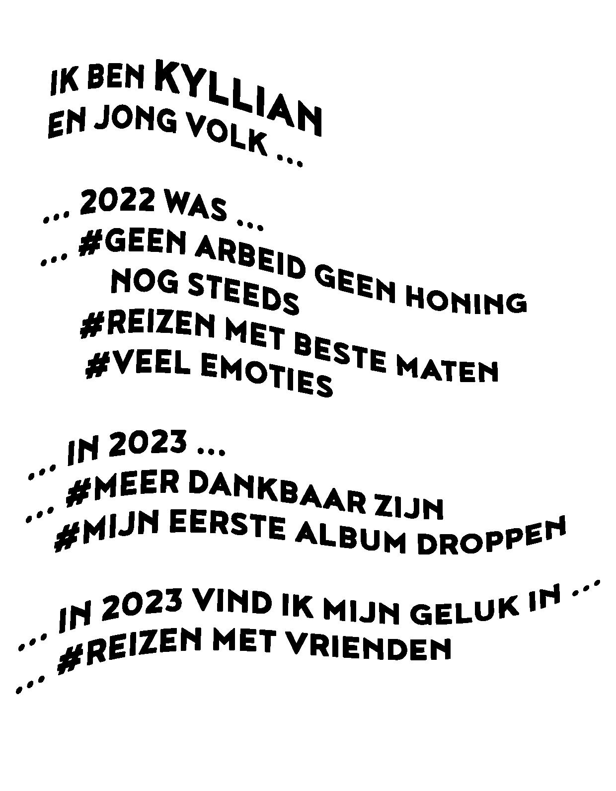 Voor het Jong Volk jaarboek 2022 vertelden 37 jongeren ons ... … hoe ze 2022 beleefden … wat hun favoriete hashtags waren … hun favoriete soundtrack van 2022 … hun strafste verhaal … … wat hun verwachtingen zijn voor 2023 … de grootste fout die ze kunnen maken in 2023 … wat hun idee van ‘geluk’ is in 2023